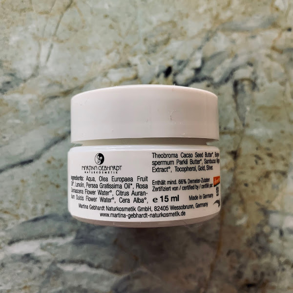 Eye Care Martina Gebhardt esta formulado con ingredientes 100% naturales y un contenido de agua del 50% aproximadamente y otro 50% de sustancias oleosas como pueden ser: Aceites vegetales, grasas y ceras; Lo que corresponde a la composición de la capa hidrolipídica ayudando a mantener la hidratacion y suavidad.