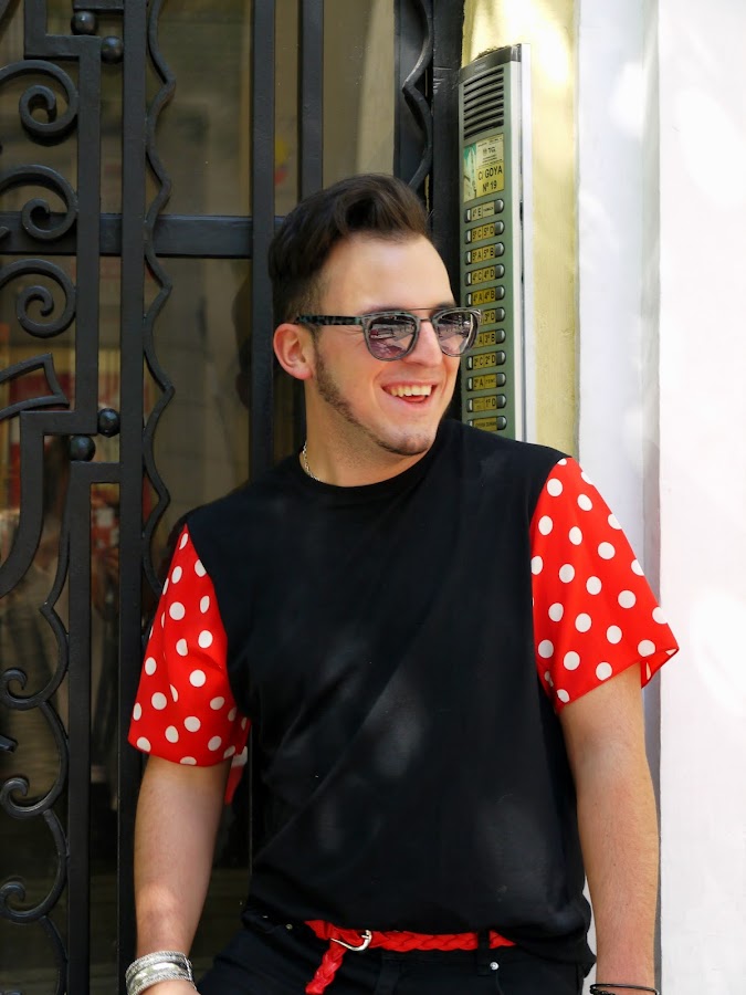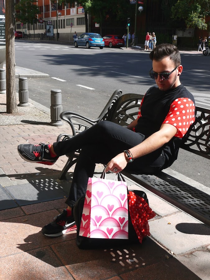 Hoy os presento una nueva camiseta, de creación propia, ¡Llena de lunares! Los que me conocéis bien sabéis que me encantan los lunares y los volantes, y no me pude resistir. Llevo un total look negro con todos los detalles en rojo: desde las mangas, el cinturón, las Air Max y el pañuelo del bolso. Con estas fotos por la Calle Serrano, obra de mi amiga Sofi, os animo a cumplir todos vuestros sueños, y encaminaros a lo que realmente queráis hacer en la vida. Sólo tenemos una y nos conviene aprovecharla. Siempre recomiendo que uséis la moda como creáis, siendo vosotr@s mism@s y creando vuestra propia identidad.