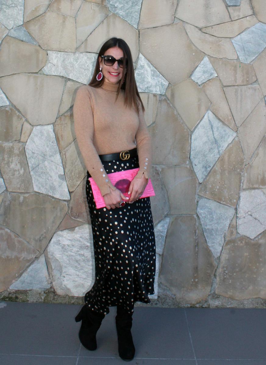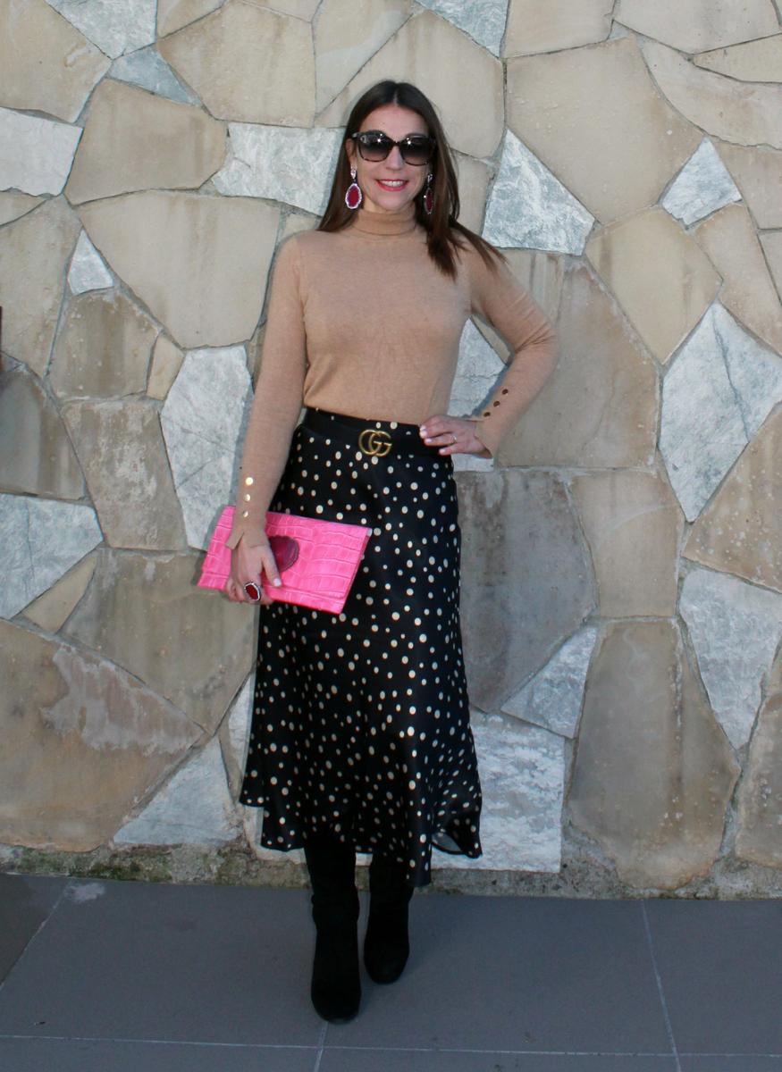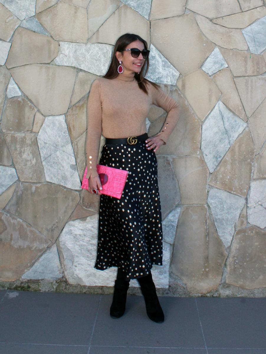 En resumen, falda larga en color negro salpicada de lunares en un tono camel, a juego con el el jersey y botas altas. El toque de color lo ponen los pendientes, el anillo y el bolso, en fucsia.