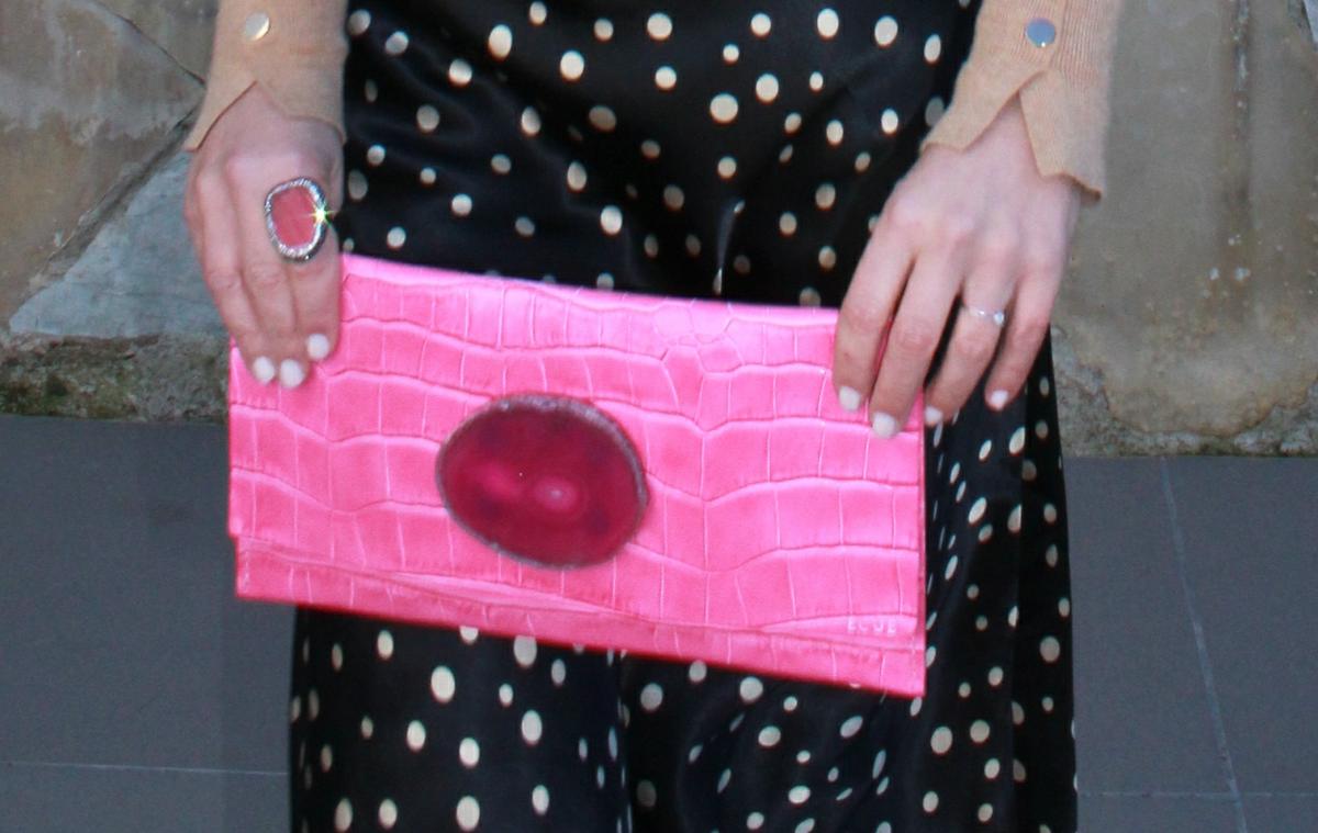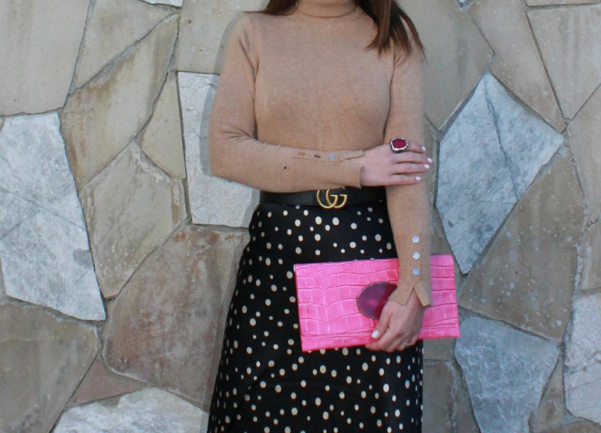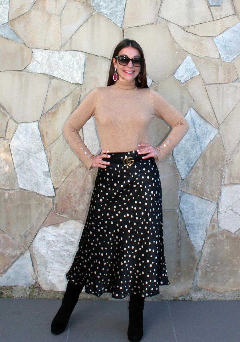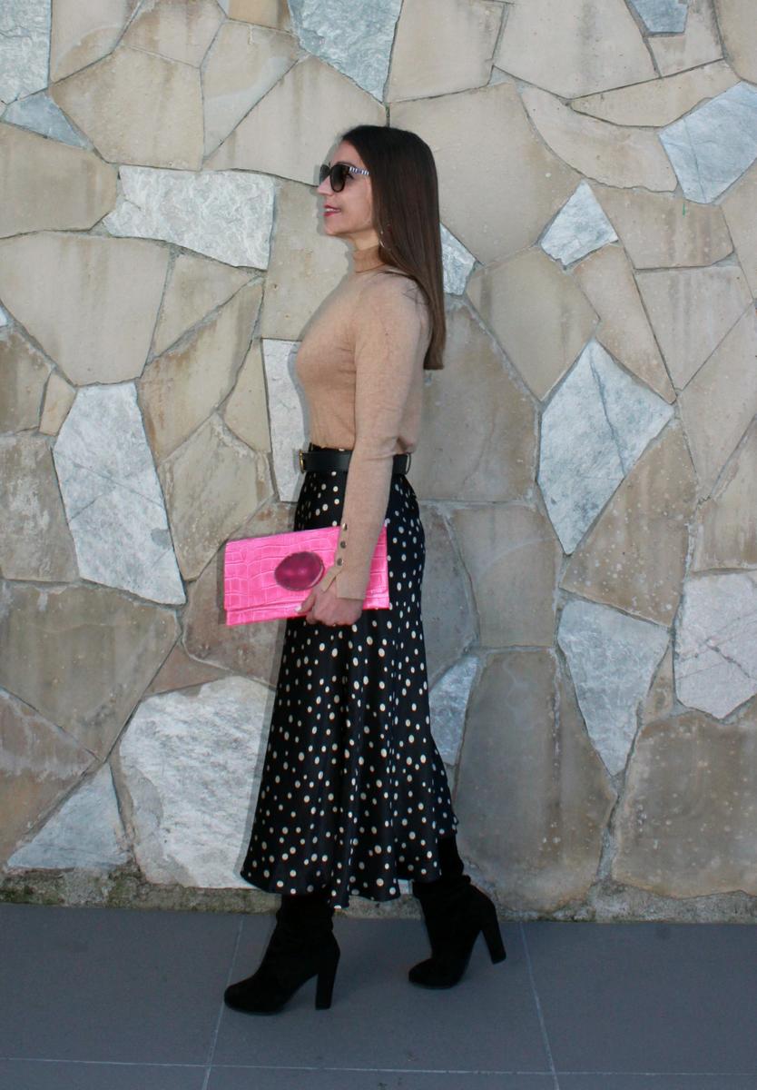 En resumen, falda larga en color negro salpicada de lunares en un tono camel, a juego con el el jersey y botas altas. El toque de color lo ponen los pendientes, el anillo y el bolso, en fucsia.