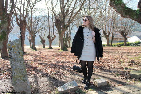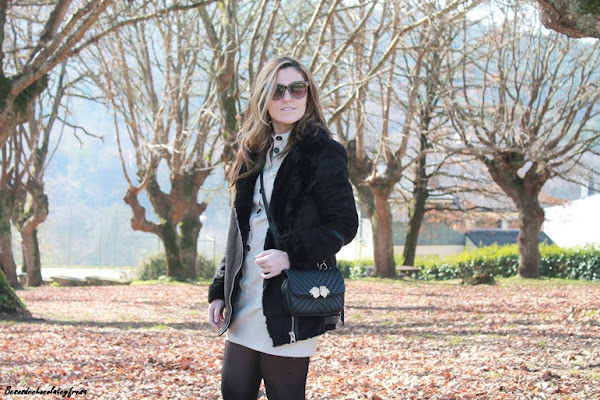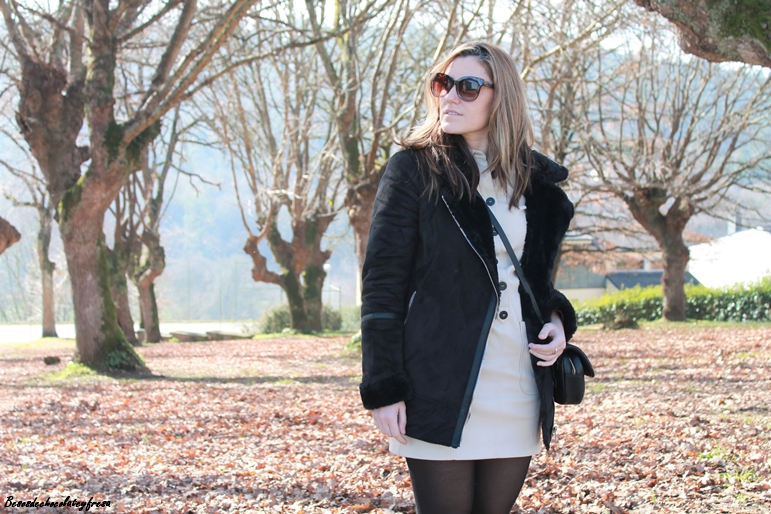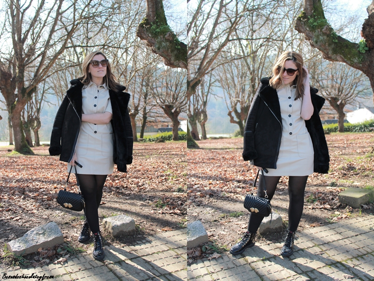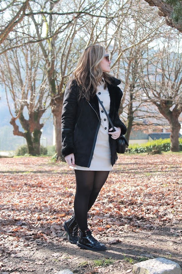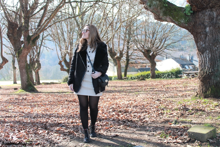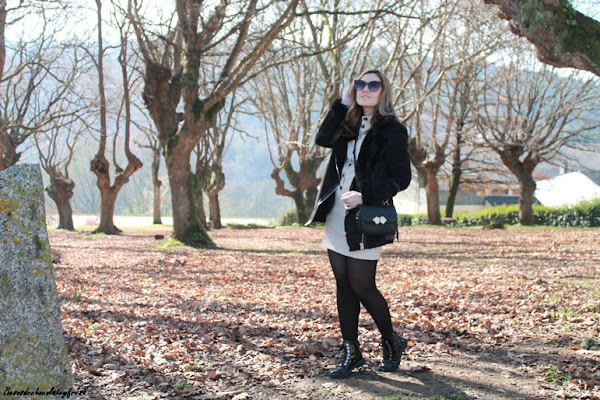 En esta ocasión aposté por el resto de prendas en color negro como son la chaqueta de ante y pelito, medias negras con botas moteras de charol y bolso también en negro.
