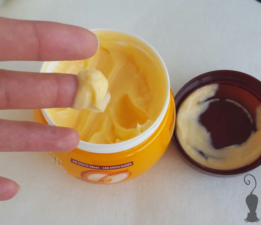 En cuanto a presentación y olor, me gusta mucho, me encantan las mascarillas en este formato de bote, sin que tengan la típica lámina de plástico duro, que yo siempre acabo tirando. La tapa es de rosca y tiene una boca ancha para poder meter bien los dedos a la hora de coger para aplicar el producto. El olor como describí más arriba es una mezcla y me gusta, me huele a verano, lo que si no noto es que perdure el olor en el cabello después de aclarada.