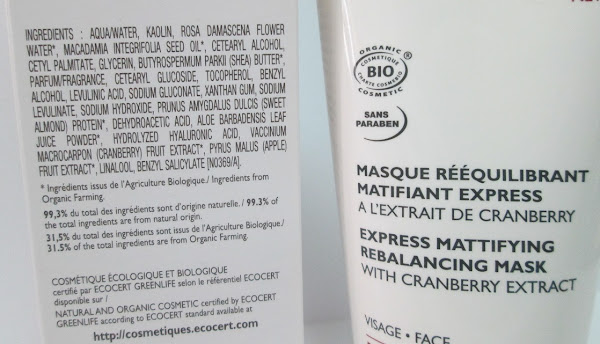 Esta mascarilla facial, se presenta en un envase de tubo, que contiene 50 ml de cantidad. Como os he comentado antes, es perfecta para pieles mixtas y/o grasas, ya que, ayuda a cerrar los poros, matificar las zonas con más sebo y, purificar e hidratar las zonas más resecas de nuestro rostro. Y, todo ello es gracias a los extractos de arándanos, el ácido hialurónico, el extracto de proteína de la almendra bio y el aceite de macadamia, del que está enriquecido. Es así, que tiene un aroma afrutado-dulzón ¡super rico!, jejeje.