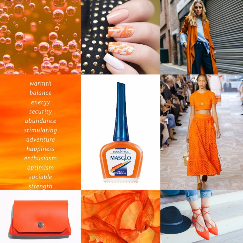 Desde el dulce melocotón y el coral lleno de energía, al mandarina vibrante, rojo-anaranjado picante, y el terracota mineral, el significado del naranja esta relacionado con la energía radiante, calor y resplandor del sol poniente. Este color es considerado como el tono más cálido y su uso, incluso en pequeñas dosis, añade chispa a cualquier combinación de colores.