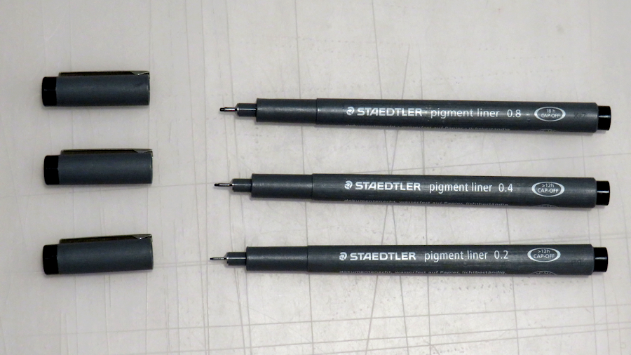 Si has visto mis ilustraciones, una de las características es que siempre van entintadas. Para ello necesitaremos un material de entintado. Hay distintos tipos, pero lo importante es que puedas optar por distintos calibres. Yo uso rotuladores calibrados, principalmente 0.2, 0.4 y 0.8, utilizando sobretodo los dos primeros. Utilizar este material es cuestión de práctica, ya que si te tiembla el pulso se notará en tu dibujo, por lo que te aconsejo siempre calentar la mano antes.