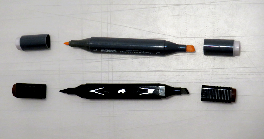 Estos rotuladores suelen tener doble punta. Una de ellas es una punta fina normal y la otra biselada, cada una se usa de forma diferente, según si queremos cubrir zonas más amplias o tener mayor precisión. Yo suelo usar, la gran mayoría de veces, la punta fina. Existen otros modelos en los que la punta fina es tipo pincel.