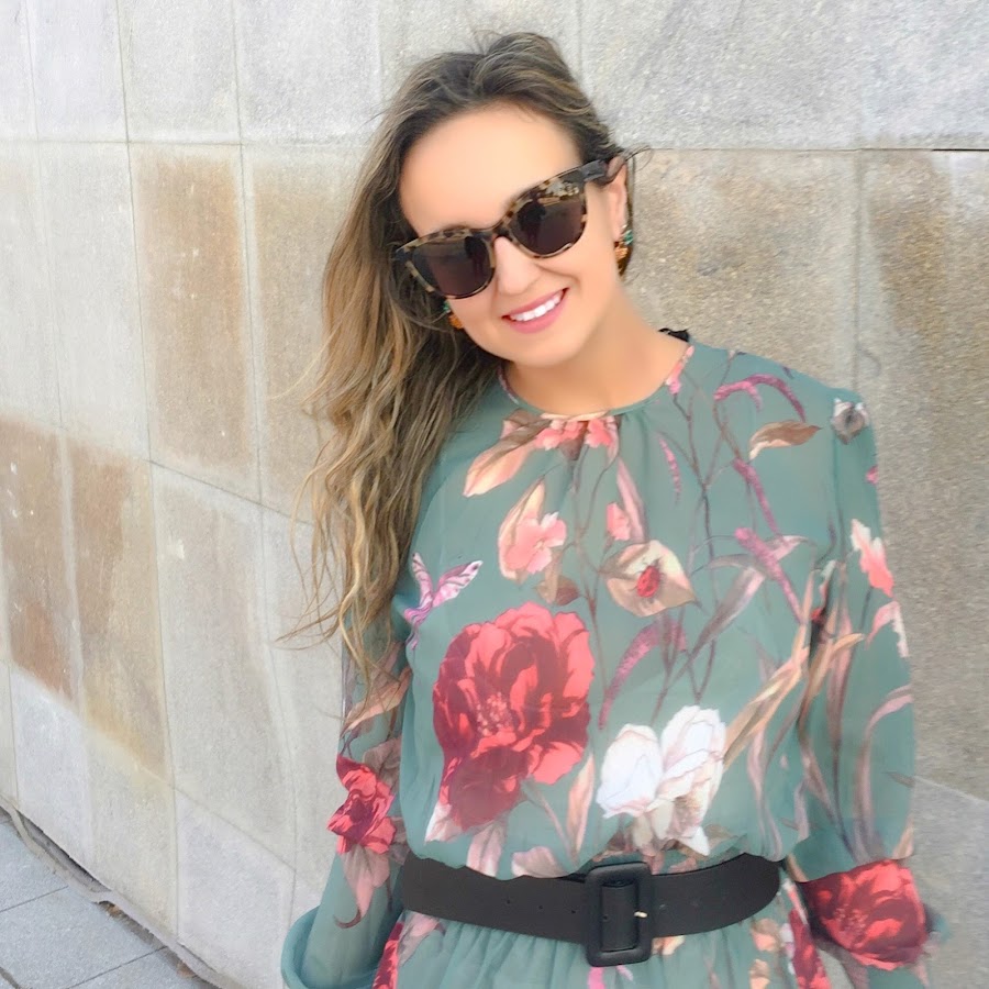 El vestido es de manga larga y lleva una goma en la cintura. La tela es ligeramente transparente, lo que da mucho movimiento al vestido, y tiene un estampado de flores en beige, rosa y rojo. Los vestidos largos de flores van a ser un fondo de armario este invierno así que os invito a haceros con uno como este.