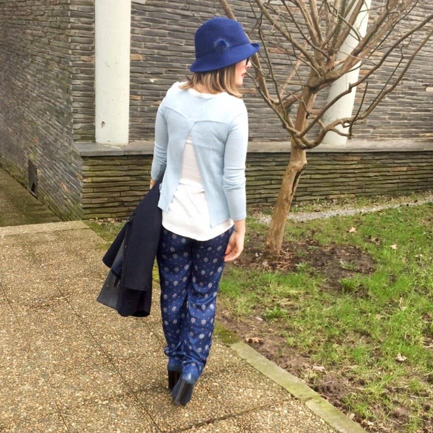 Los pantalones de inspiración navy solo los he puesto por el verano pero hoy me apetecía hacer un guiño a la temporada que ya se está acercando y los combiné con jersey y bolso azul cielo. Empiezan a apetecer los tonos claritos.