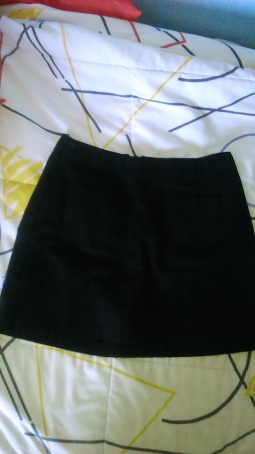 No se aprecia muy bien, pero es una falda negra con dos bolsillos grandes en la parte delantera. Queda ceñida a la cintura y es perfecta para poner debajo una camiseta y salir arregladita. La hay en negro, mostaza y teja. Es la talla 36 y me ha costado 7,99€.