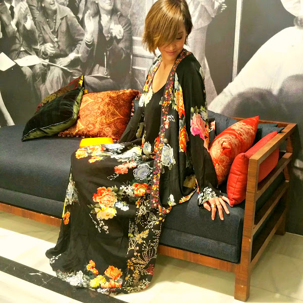 ¿Sabéis una de las cosas que más me gusta del verano? Las noches en las que da gusto llevar prendas muy ligeras y delicadas, que apenas se posan y rozan el cuerpo. Para ello, los maxivestidos son la prenda estrella, y este de Johnny Was con estampado de flores y cierto aire oriental es de diez. Me pareció una elección acertada para una boda de noche de estilo relajado o incluso campestre gracias a las sandalias y el bolso de rafia que escogimos como complementos, o para una cena en un jardín. Y si refresca un poco, ese kimono... es