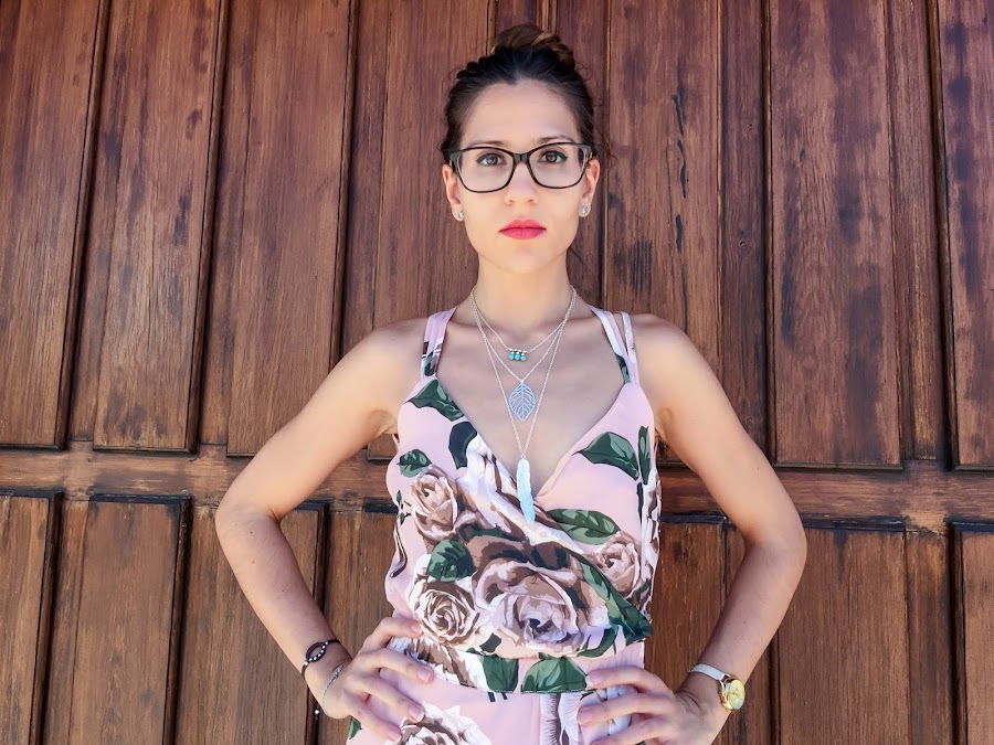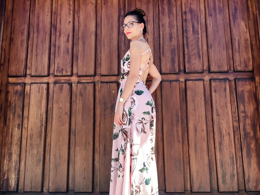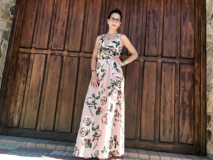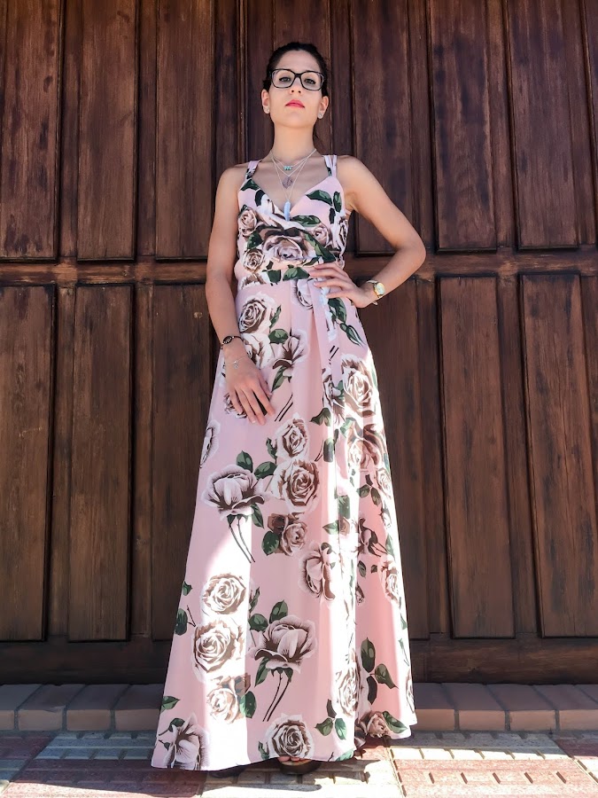 El vestido que os traigo hoy, me encanta, porque puedes ponértelo tanto para una cena como para algún evento especial, incluso para una boda. El estampado floral nunca falla, con unas rosas en tonos marrones y verdes en un fondo rosado, que hace que destaque más. La espalda, por supuesto, es descubierta y con tirantes cruzados.