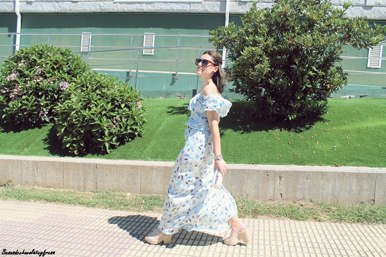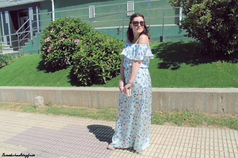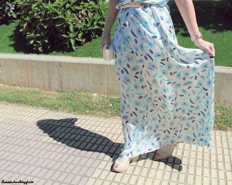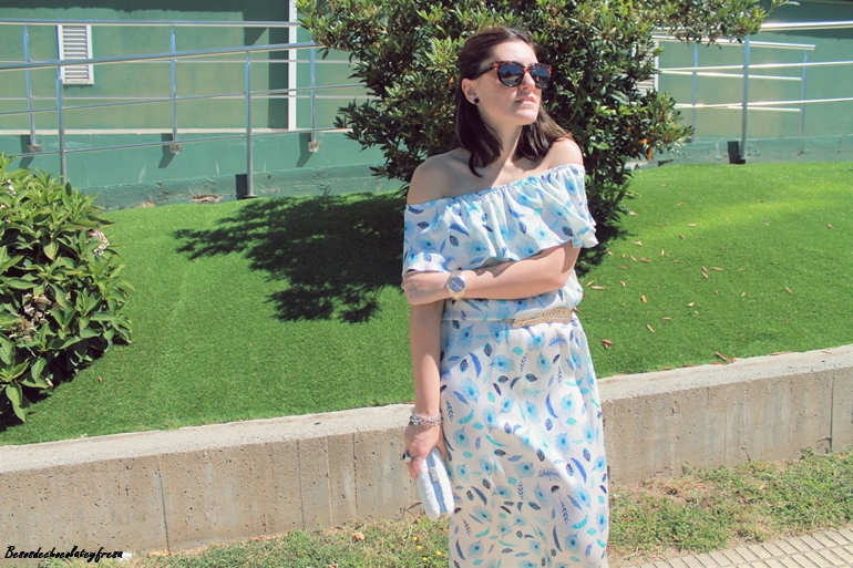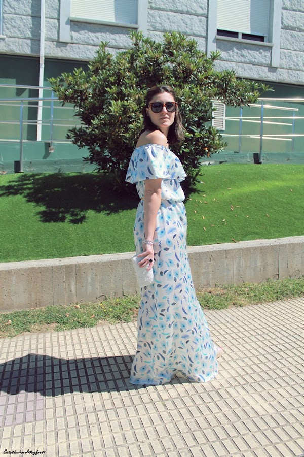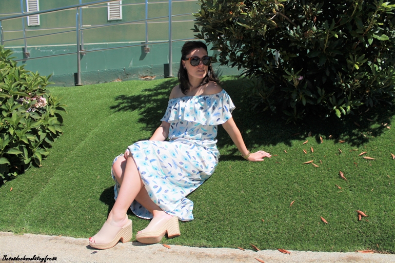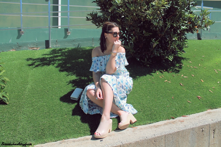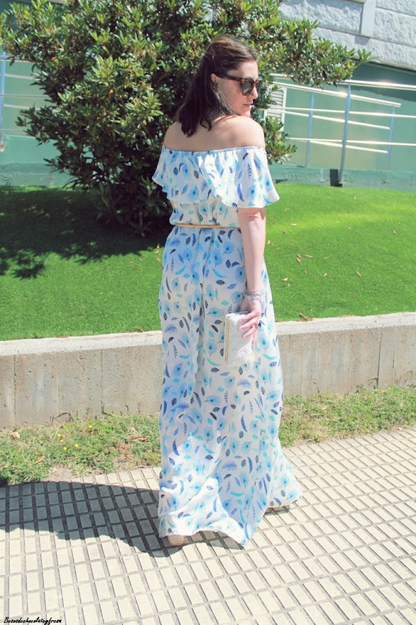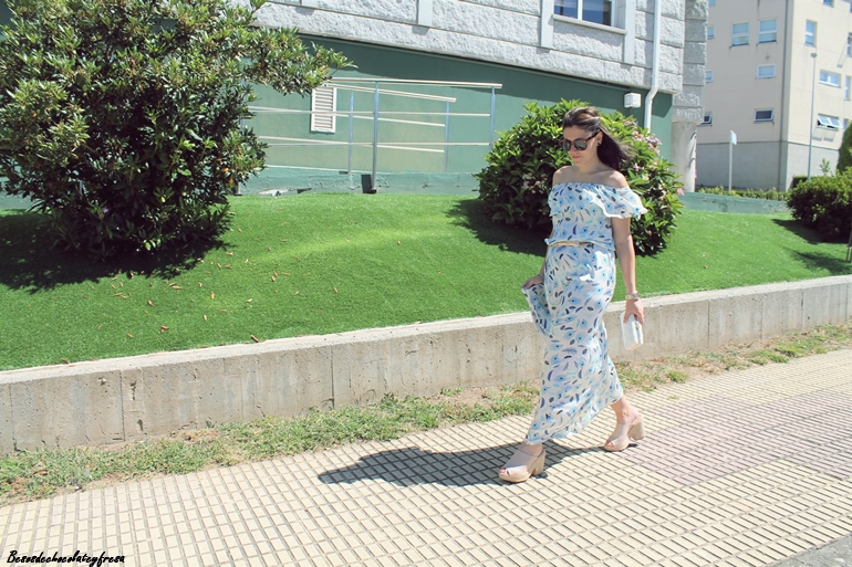 Yo esta vez me decante por un look formal e informal a la vez pues llevo a mis pies cuñas de esparto y luego contrarresto lo informal con clutch de perlas y cinturón dorado de hoja a juego con el estampado. Hombros al aire y a disfrutar.
