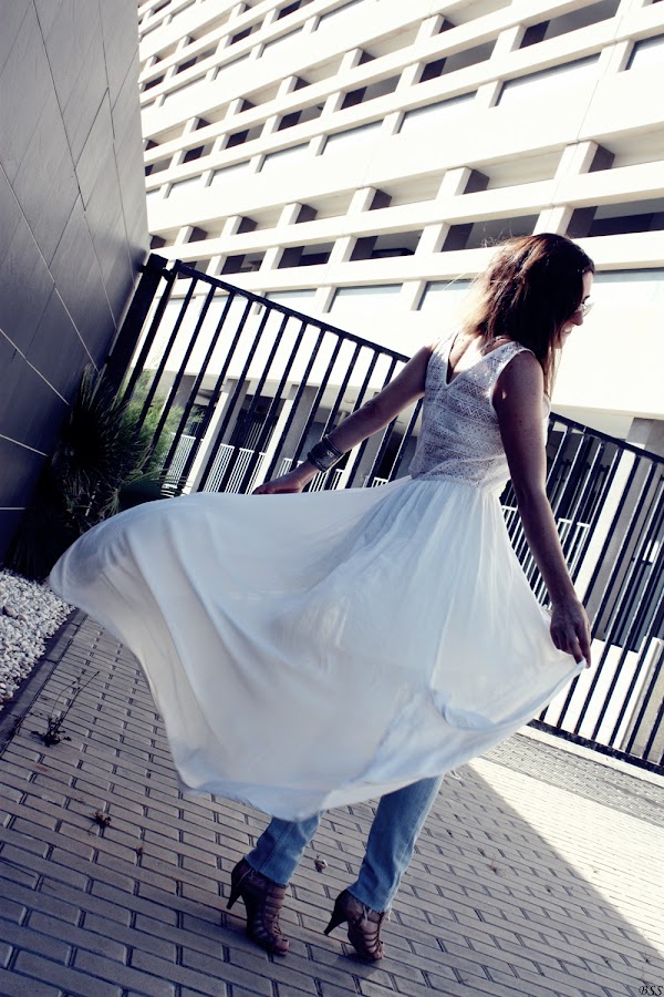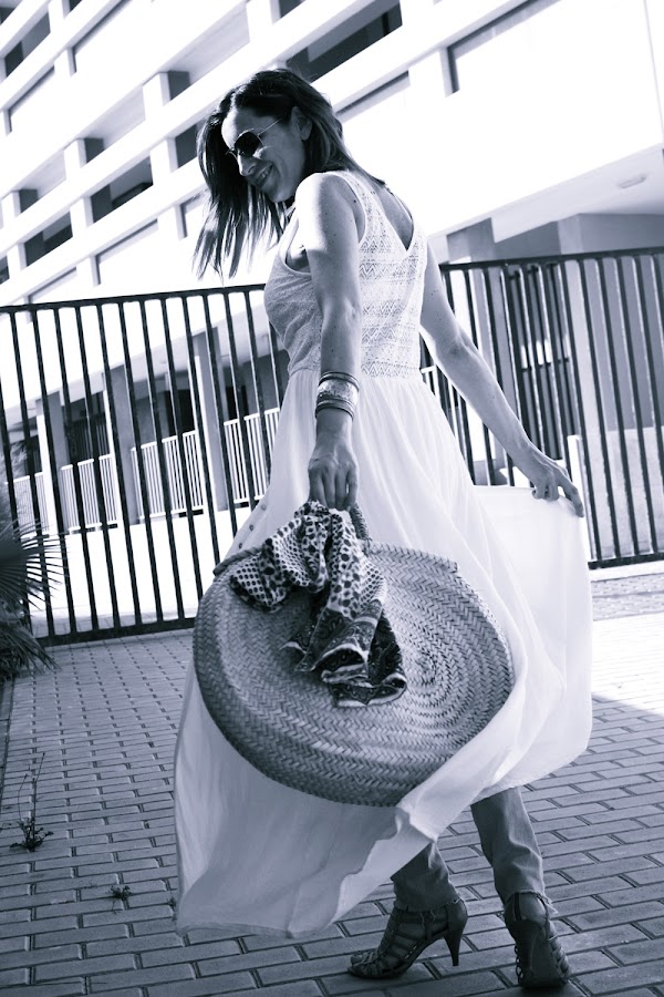 Hoy mi propuesta viene con un maxi vestido blanco que combino con unos jeans rotos y el capazo de moda de esta temporada.