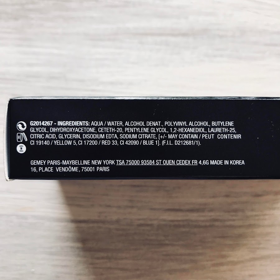 AQUA / AGUA, ALCOHOL DENAT., ALCOHOL POLIVINILO, BUTYLENE GLICOL, DIHIDROXIACETONA, CETETH-20, PENTILENGLICOL, 1,2-HEXANEDIOL, LAURETH-25, ÁCIDO CÍTRICO, GLICERINA, EDTA DE DISODIO, CITRATO DE SODIO, [+/- MAY CONTAINCI 19140 / AMARILLO 5, CI 17200 / RED 33, CI 42090 / AZUL 1,] (FIL D204654 / 1)
