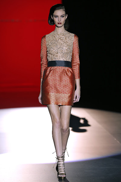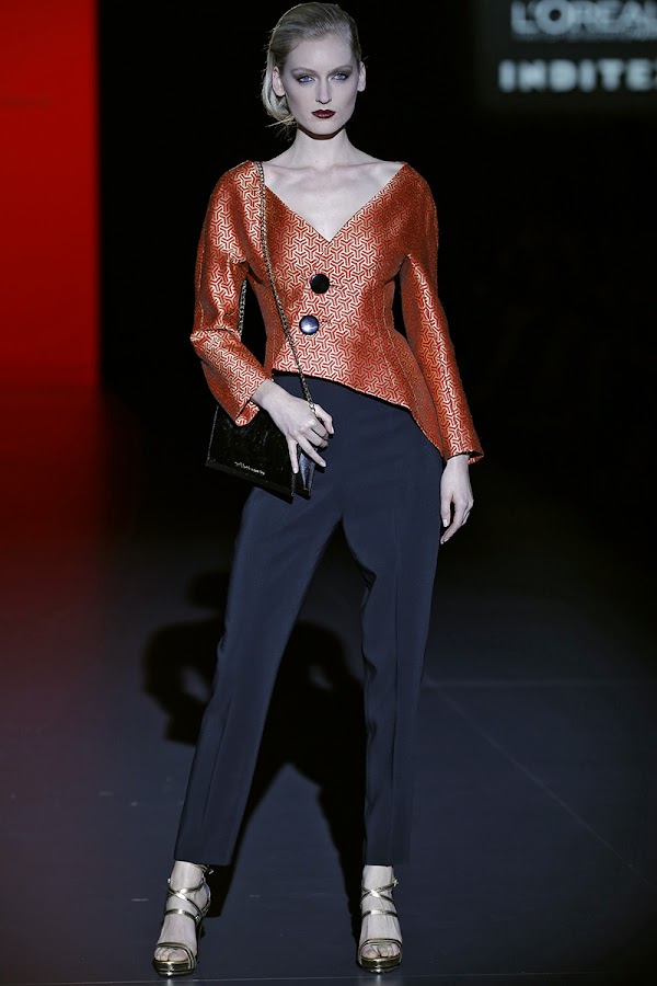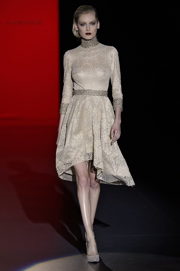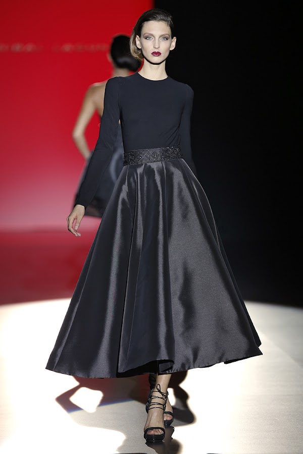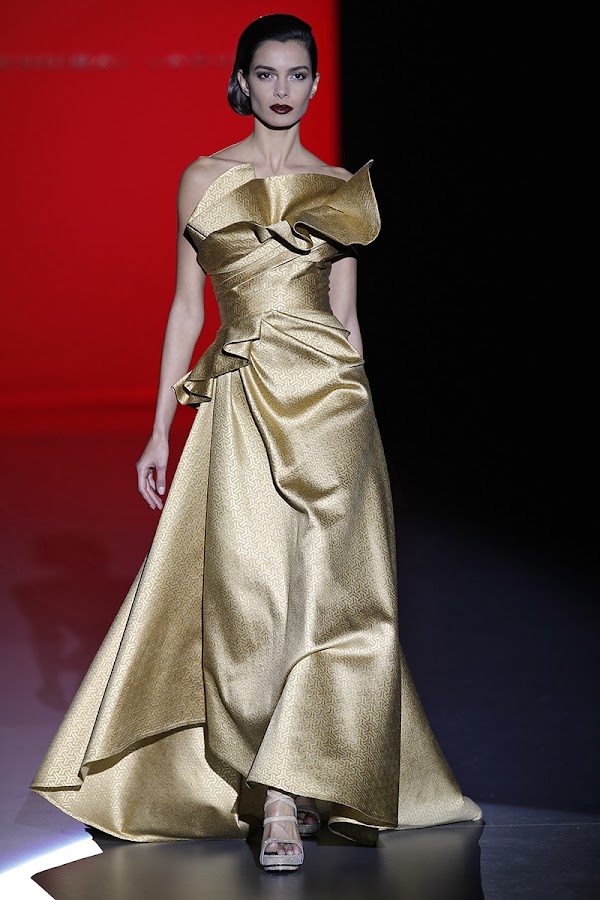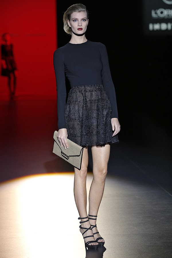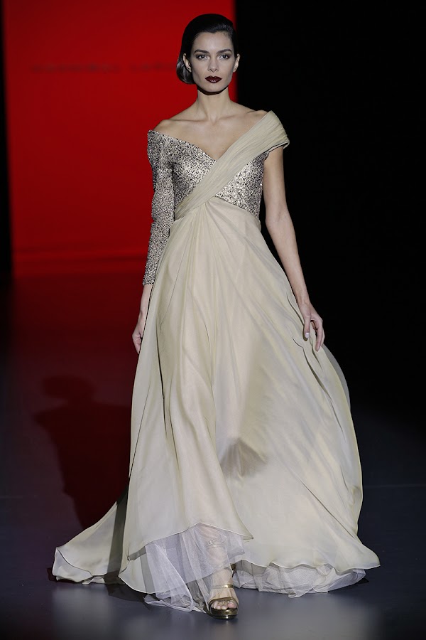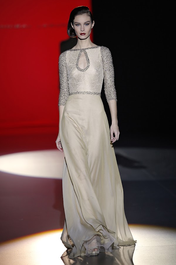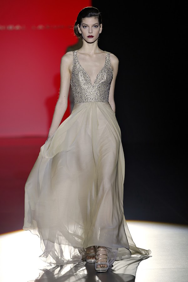 Hannibal Laguna es sinónimo de sofisticación y de elegancia, de la unión entre la tradición y la modernidad, de los tejidos satinados y las incrustaciones de pailletes.. Destacan en su colección los colores negro y oro, con algún toque naranja, las cinturas marcadas, los pliegues, la manga francesa, los bordados impecables.