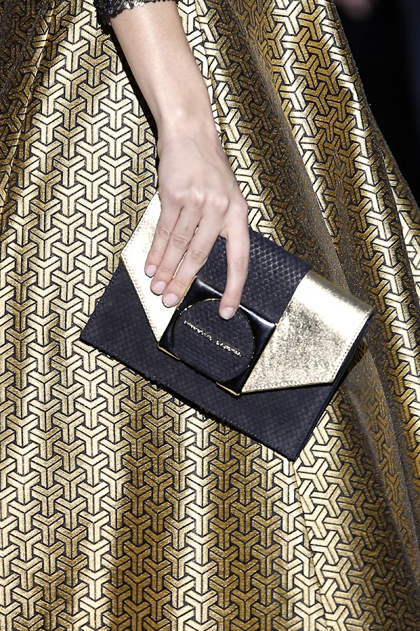Los zapatos y bolsos son creación del diseñador, las sandalias de tiras negras y doradas junto con los stilettos me parecen ideales para cualquier época del año.