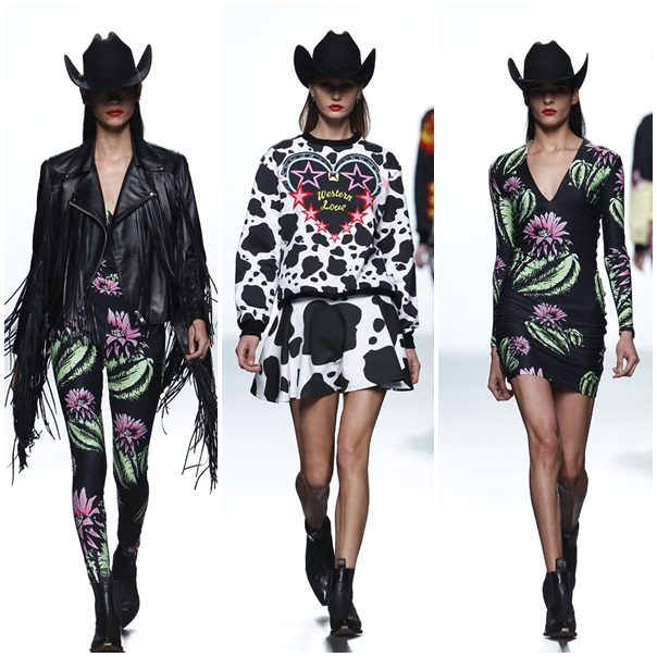 MARÍA ESCOTÉ, en su colección "Far Love" se pudieron ver camisas cowboy, cazadoras denim, flecos, piel de vaca y un sinfín de referencias al lejano oeste, temática en la que estaba inspirada su colección.