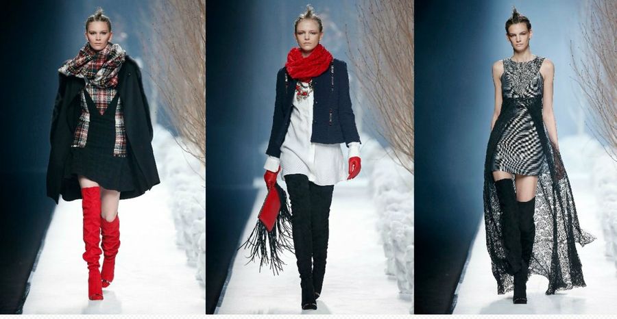 Esta edición Agatha Ruiz de la Prada ha mostrado su colección más confortable gracias a prendas de cortes sencillos, convertibles mediante cremalleras y jugando con los volúmenes. Los tejidos van desde sedas 100% en satenes lisos y estampados, lanas de paño para los abrigos, crepés en pantalones y vestidos y, por supuesto, terciopelo y jacquards personalizados con sus alegres estampados, como topos, flores o estrellas. Tampoco faltaron los tejidos metalizados, peluches y neoprenos, además de microlentejuelas para la noche.