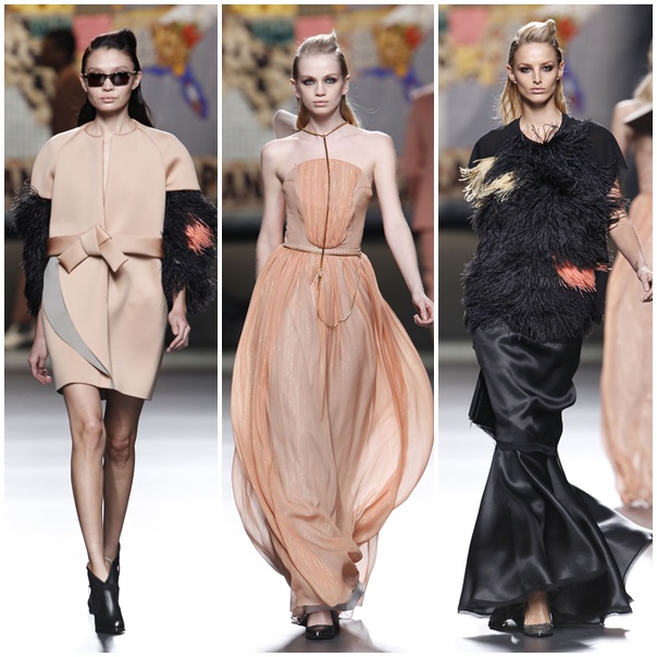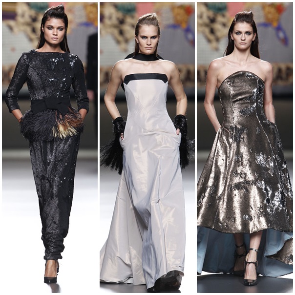 JUAN VIDAL, premiado por segundo año consecutivo a la mejor colección, presentó "Diana y las bestias", una colección con estampados en diferentes tonalidades, lentejuelas, pedrería, detalles en pelo e increíbles abrigos de paño. Destacar las sandalias en visón y zorro creadas por la empresa de calzado alicantina Nacho Rivera.
