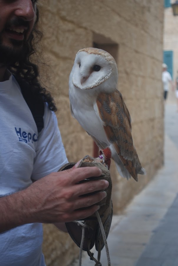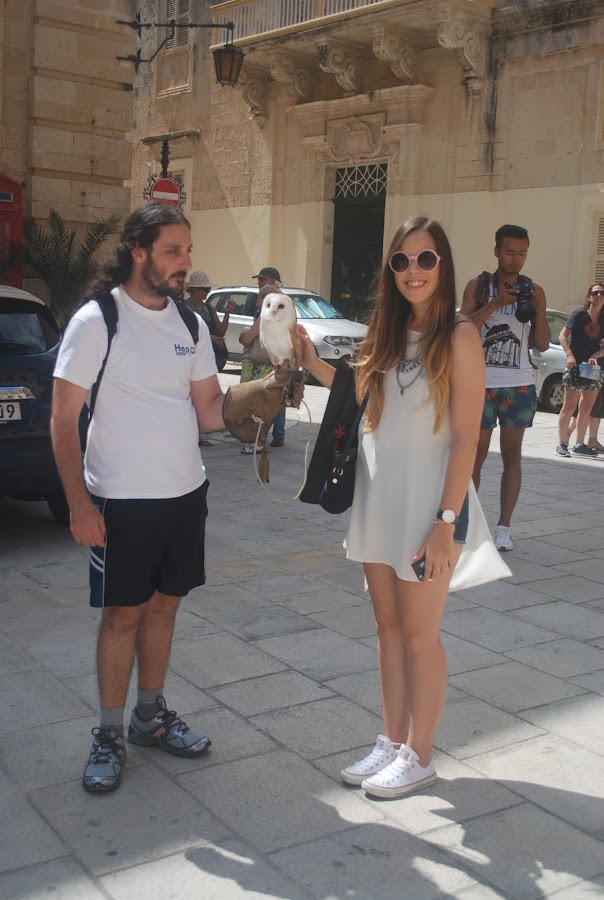 Paseando por Mdina nos encontramos a este chico y a su lechuza. Era super majo y nos dejó acariciarla y hacernos una foto con ella (a Sergio le daba miedo así que nada). Era super adorable.