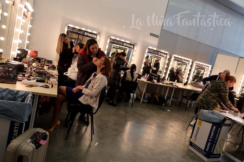 Nada más llegar, me sentía super contenta, como una niña pequeña con zapatos nuevos pero cambiando los zapatos por una pulsera al más puro estilo ‘all inclusive’ que me hacía sentir super VIP y que me permitía recorrer ese paraíso de maquillajes, peluquería, moda y complementos… allí me hubiera quedado mirando con la boca abierta (y de hecho lo hice) cómo peinaban, maquillaban y preparaban modelos con una profesionalidad latente en cada una de las decenas de personas que sumaban para que ese desfile de SIMOF 2018 saliera tan perfecto como fue.