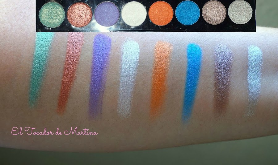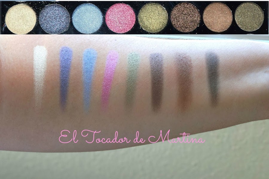La paleta tiene una calidad más que buena para ser low cost, los tonos se te meten por la vista inevitablemente, y es muy variada tanto en colores como en acabados: desde el mate hasta el glitter pasando por satinados y metalizados, y desde varios tonos de marrón hasta el azul, bastantes morados, un cobre y un par de verdes a mi juicio impresionantes.