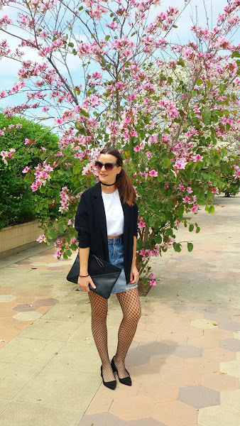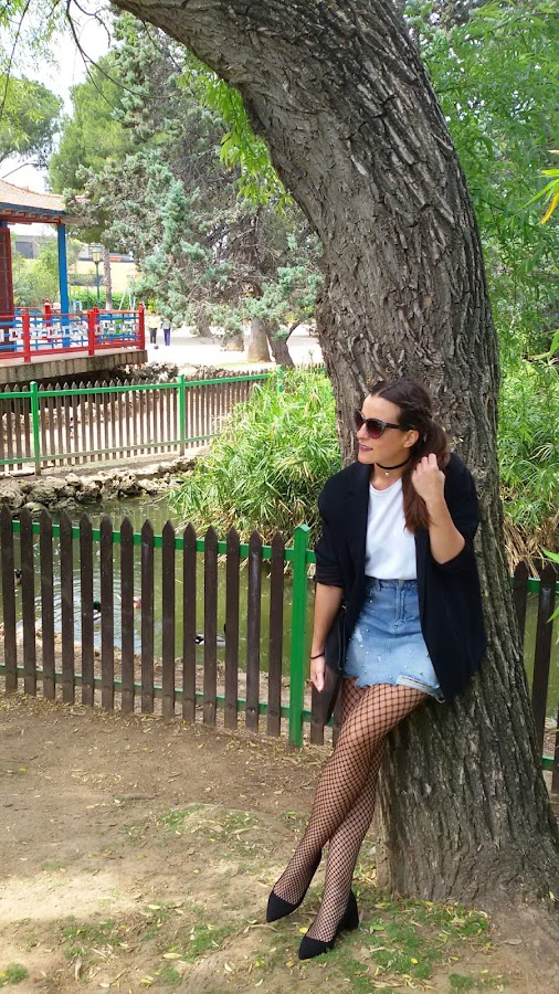 Todo ello, lo combiné con una blazer negra larga, medias de rejilla y estos zapatos que no paro de utilizar y es que son muy cómodos y con poquito tacón.