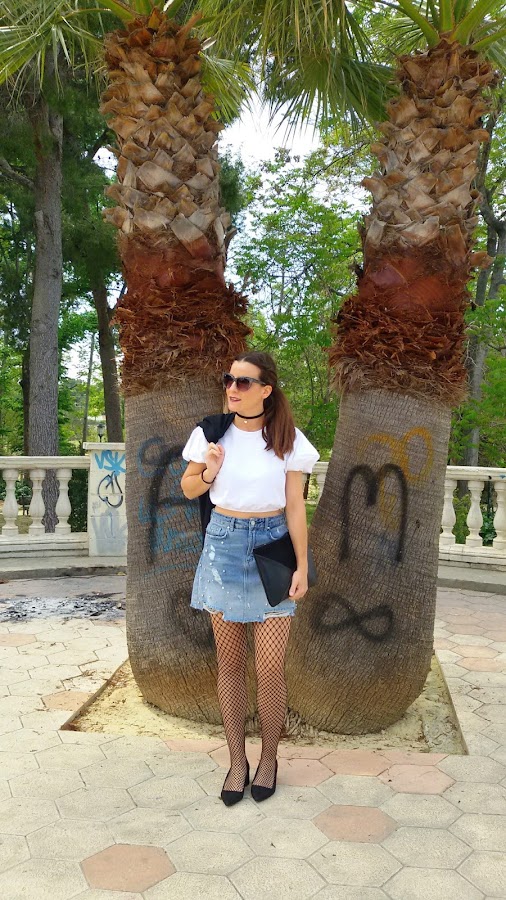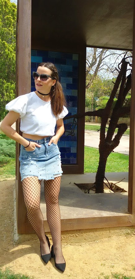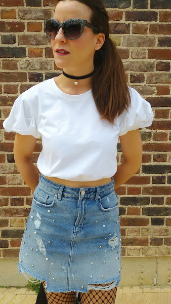 Esta falda vaquera de tiro alto y con perlas en la parte delantera y algún roto, me pareció todo un acierto para mi armario y así, utilizarla tanto para un look arreglado como desenfadado .