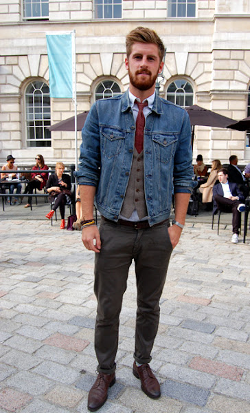 una manera de darle toque formal a la cazadora vaquera: chaleco + corbata