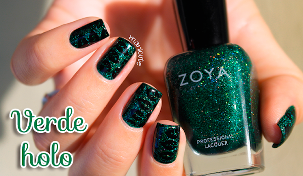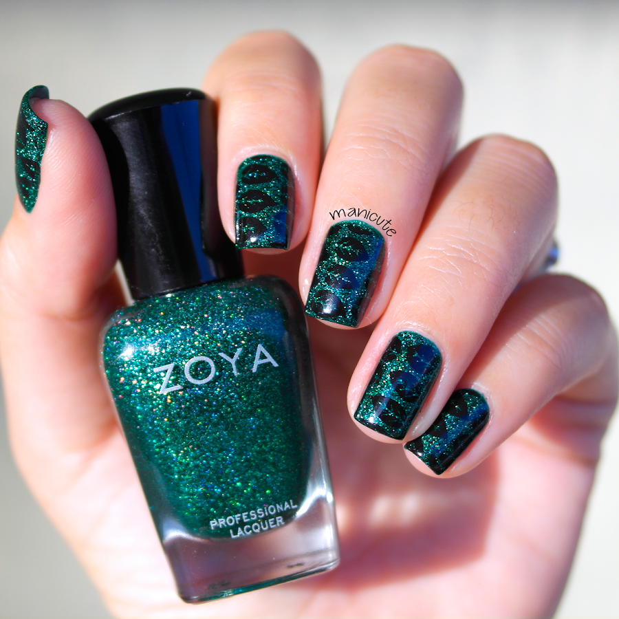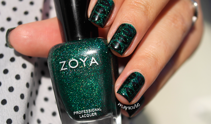 Como no quería tapar lo precioso del color verde, elegí hacer una estampación sencilla con unas hojitas de una placa de MoYou en un tono oscurito. El negro me pareció la mejor opción; parecen unas uñas lisas pero te acercas y ¡sorpresa! Hojitas adornando un esmalte verde :)