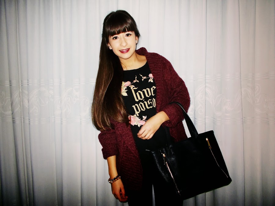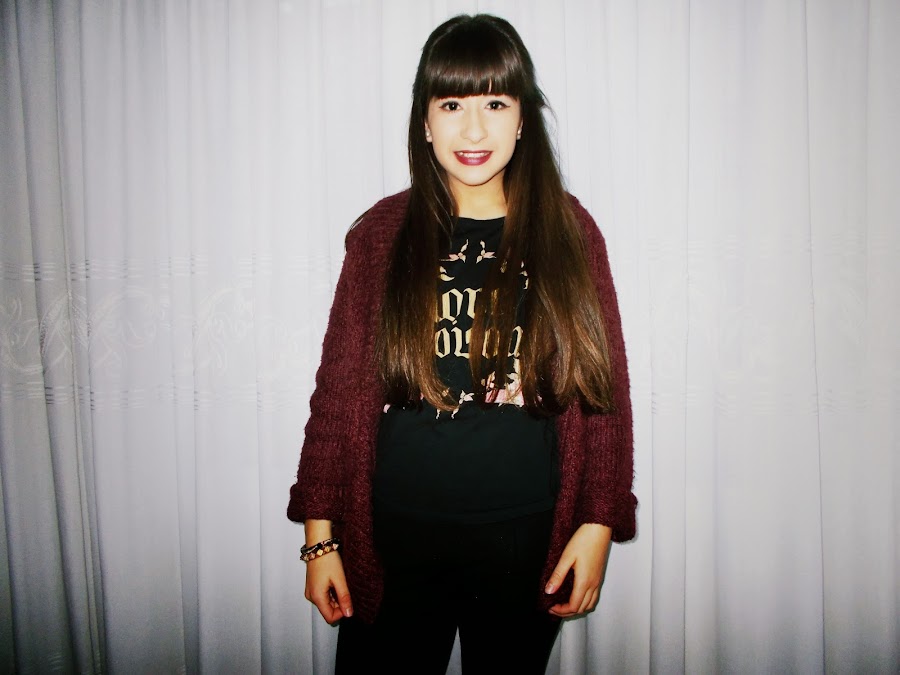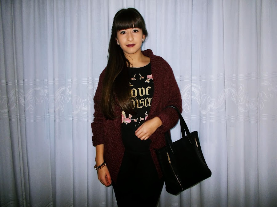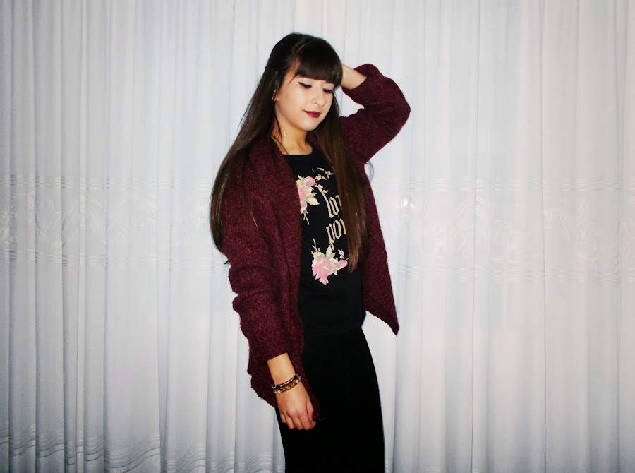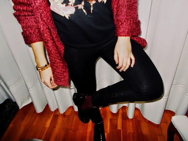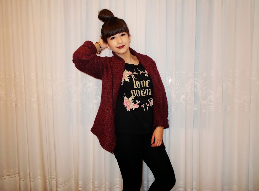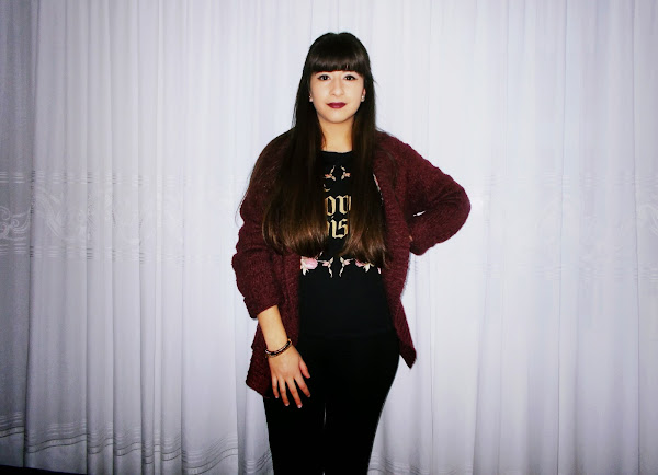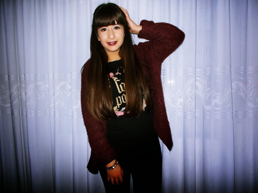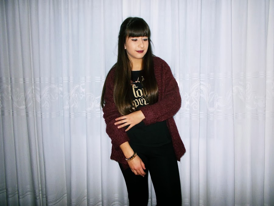 La prenda estrella del outfit de hoy es un cardigan granate adquirido del armario de mi madre del que a veces saco maravillas, últimamente me he aficionado a estas prendas y me gusta combinarlos con una camiseta basica o con un mensaje, leggins negros (como en este caso) o unos jeans y terminando con botas o botines.