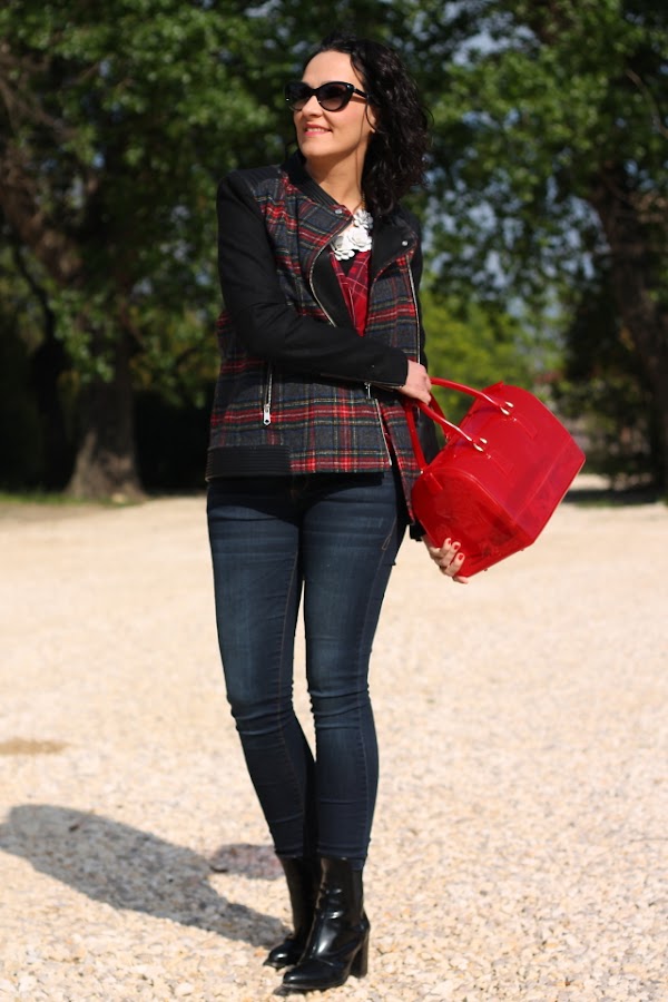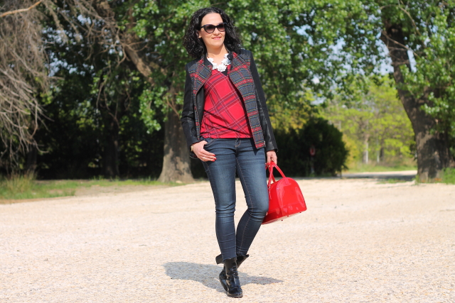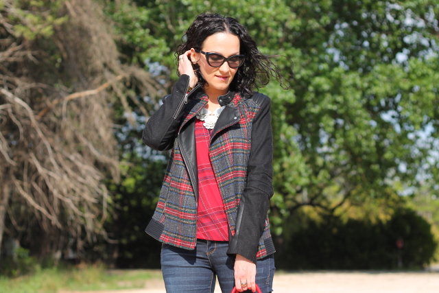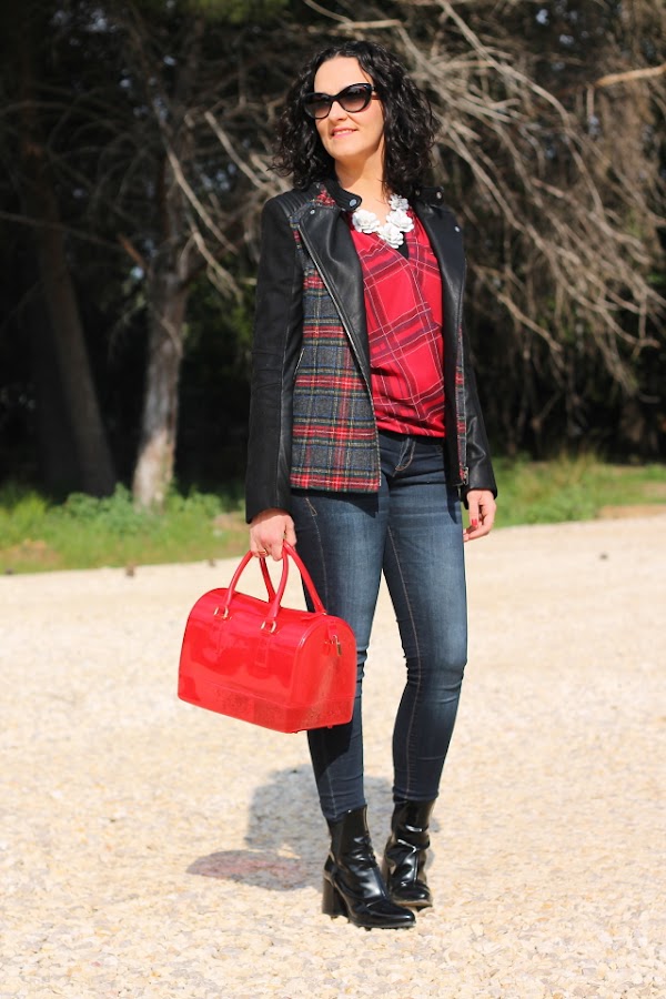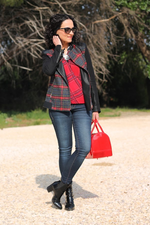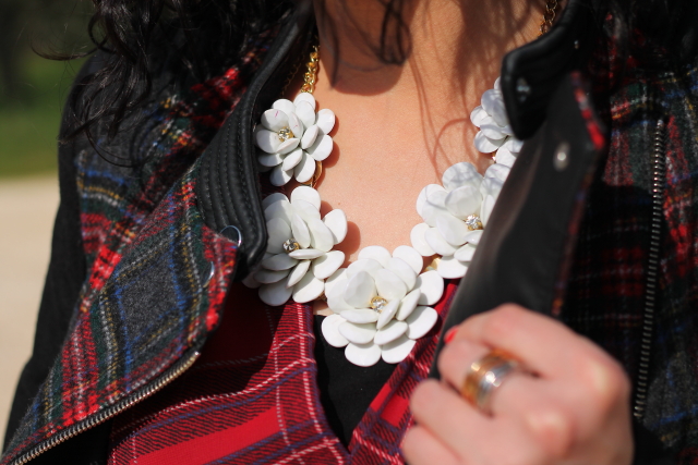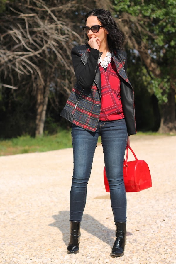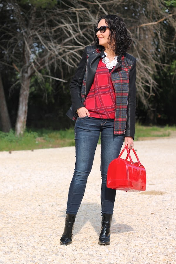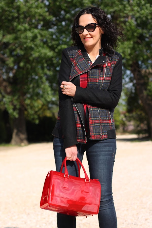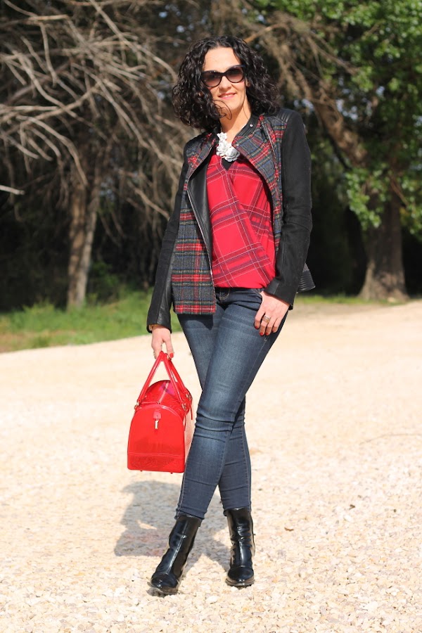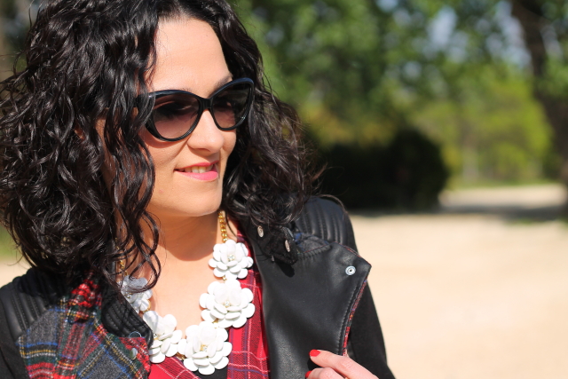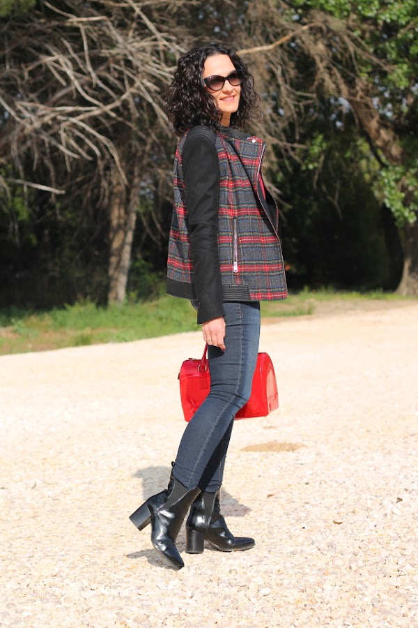 Normalmente no suelo arriesgar mucho a la hora de mezclar estampados, pero ayer, cuando estaba decidiendo que chaqueta ponerme enseguida me vino a la cabeza esta biker. Para sorpresa mía el resultado de la combinación del estampado tartán de la blusa con el de la chaqueta me encantó. Creo que a partir de ahora me voy a ir animando más a utilizar estos combos.