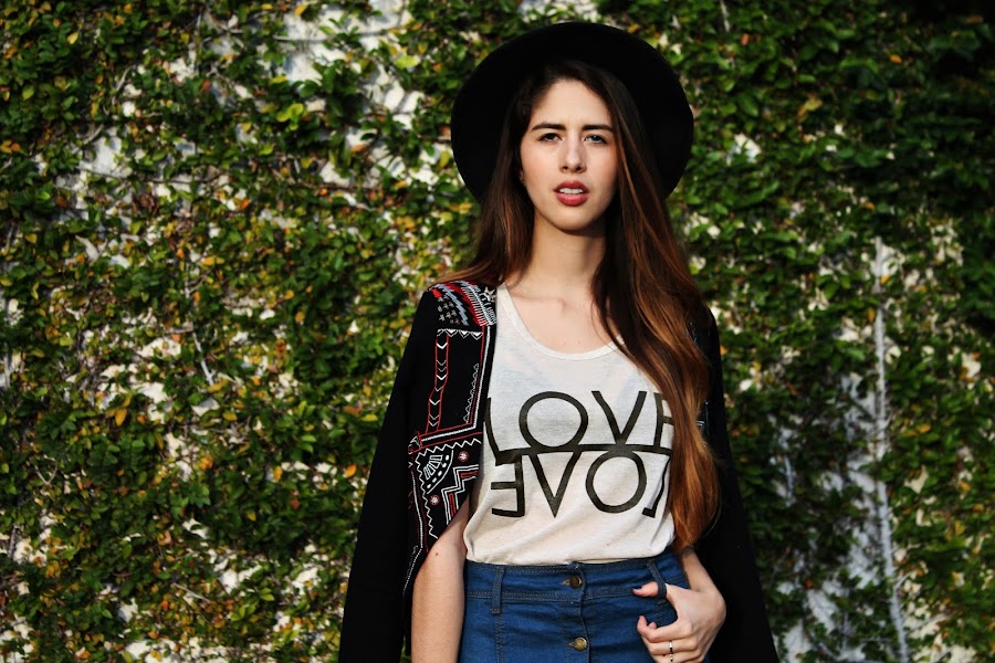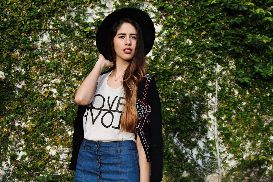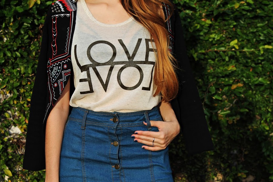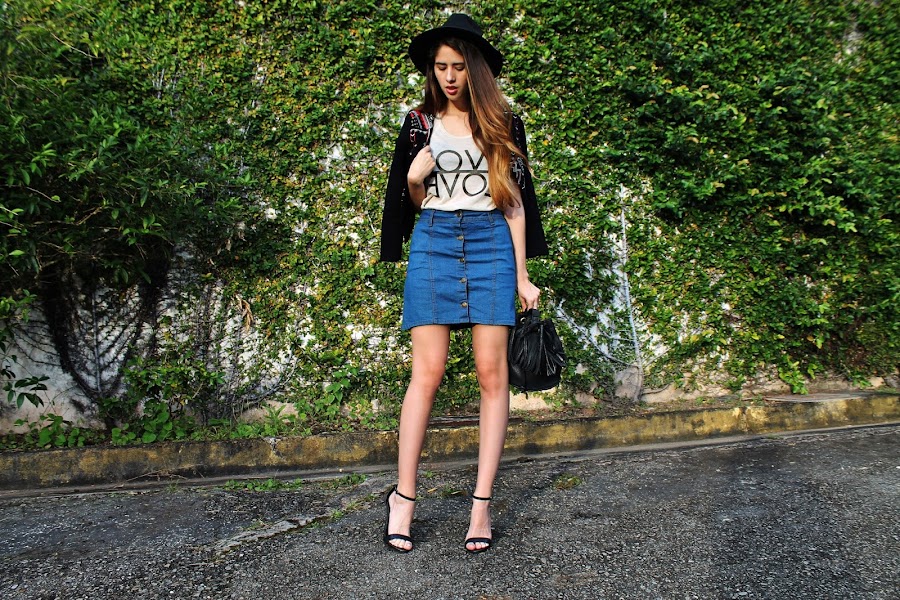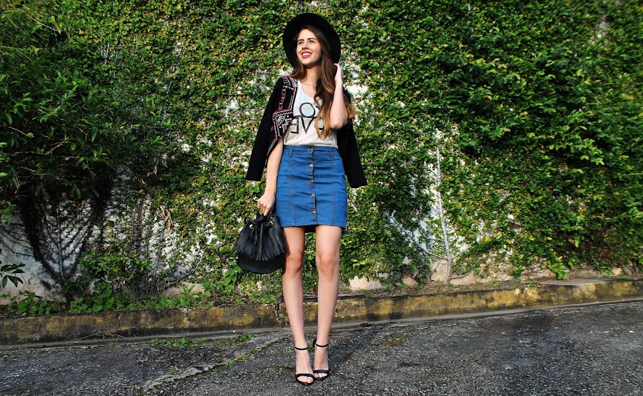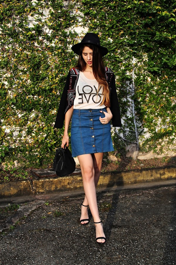 En esta ocasión la combine con una falda de jean y botones (que por cierto sigue aún de moda), una chaqueta con estampado étnico, sombrero, sandalias negras simples y mi bandolera de flecos y me encanto el resultado final es muy femenino, fresco y simple.