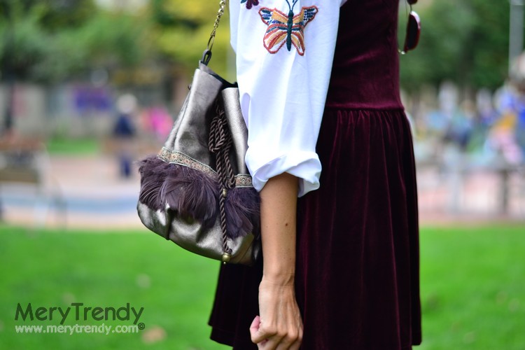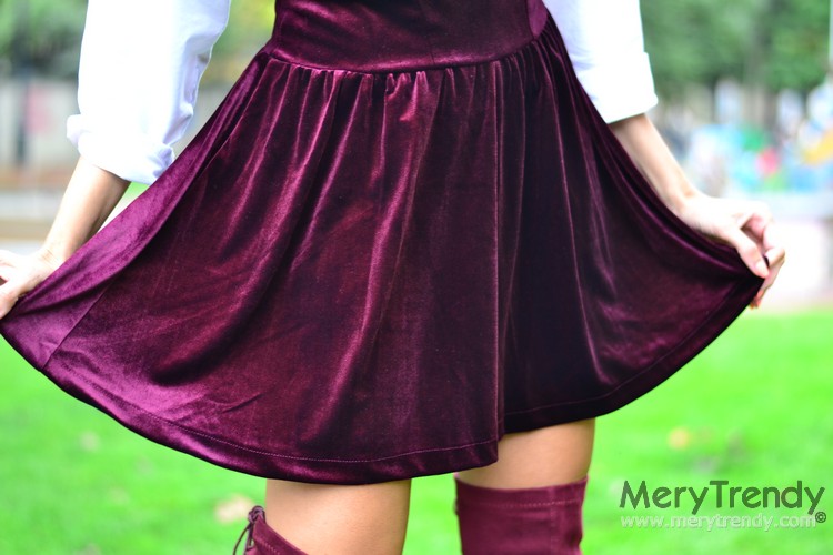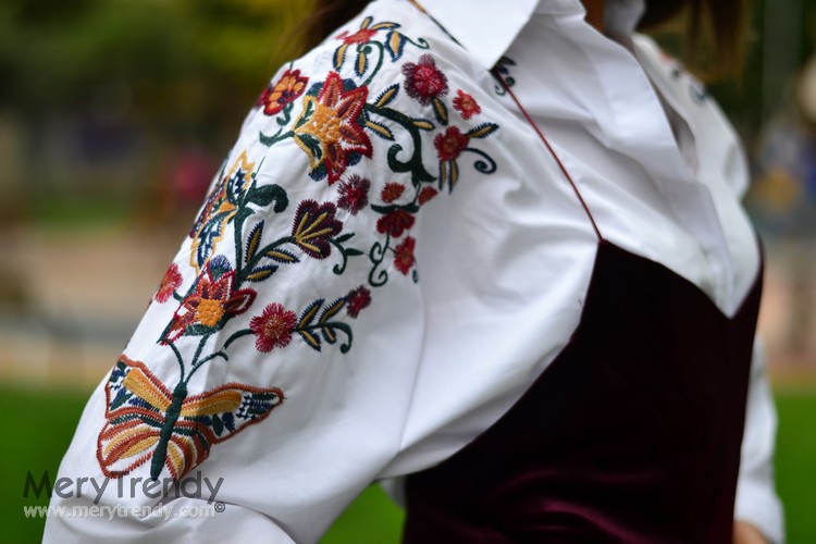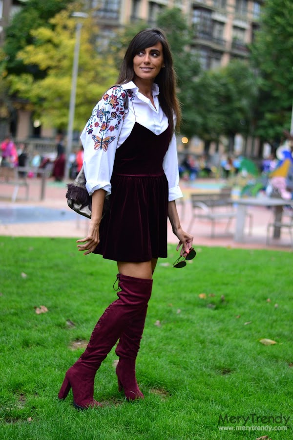Hoy os enseño el típico mono corto aterciopelado en granate, con escote en pico pronunciado, muy abierto, y tirantes muy finos que van cruzados a la espalda, con la particularidad de que, buscando el efecto "pichi", le he metido debajo una camisa con flores bordadas para darle un aire más casual y no tan "festivo" como el que resultaría si llevase solo el mono y así poder utilizarlo en el día a día en vez de relegarlo solamente a la noche por su tipo de tejido y profundo escote.