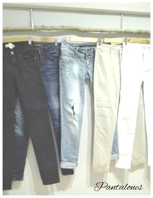 Un pitillo tejano oscuro, un tejano color claro estilo boyfriend, un pitillo blanco, un pantalón de corte recto en color azul marino y un pantalón ancho en color beig.