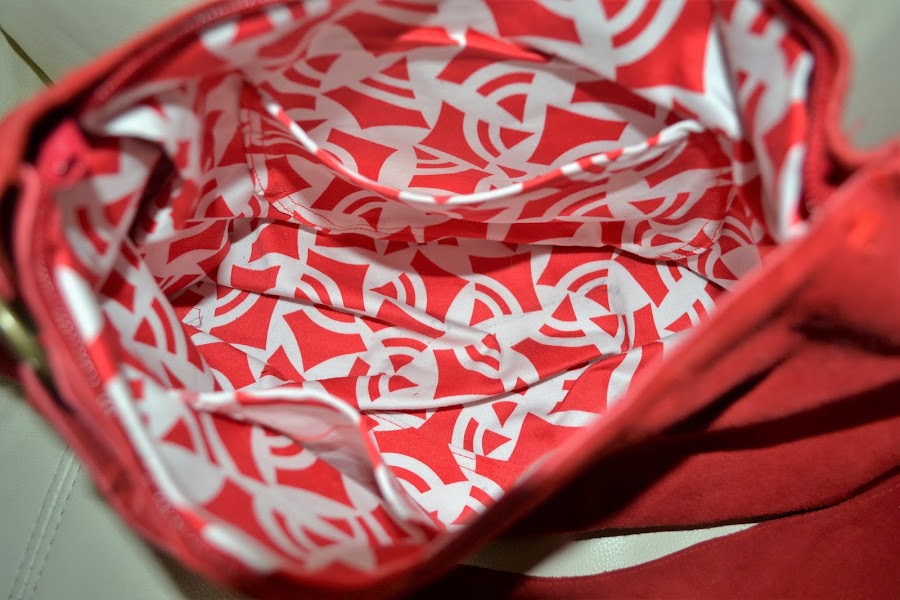 Para forrarlo he utilizado una tela estampada en rojo y blanco de algodón, con la misma forma del bolso y dos bolsillos dentro.