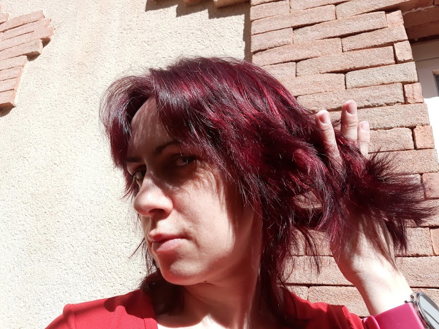 Ahora unos días más tarde y algunos lavados (por fin un día con algo de sol y os puedo sacar más fotos) he soltado bastante color, sin embargo, la toalla se ha manchado mucho menos que otras veces, el color me resulta precioso ya tirando más a granate oscuro, un tono que me encanta, dependiendo de como me dé el sol, se me notan las mechas más rosas pero quedan chulísimas, os dejo algunas fotos más para que veáis bien el color unos días más tarde y espero en comentarios si os gusta mi nuevo look, si os atreveríais vosotras a poneros éste color, si me queda bien u os gusto más en morena... en fin, que os parece??