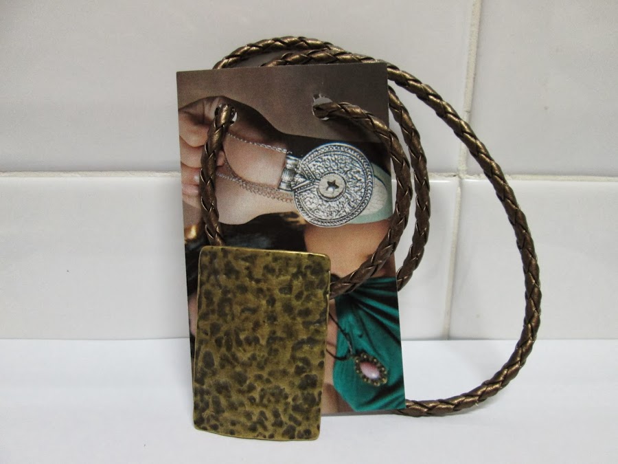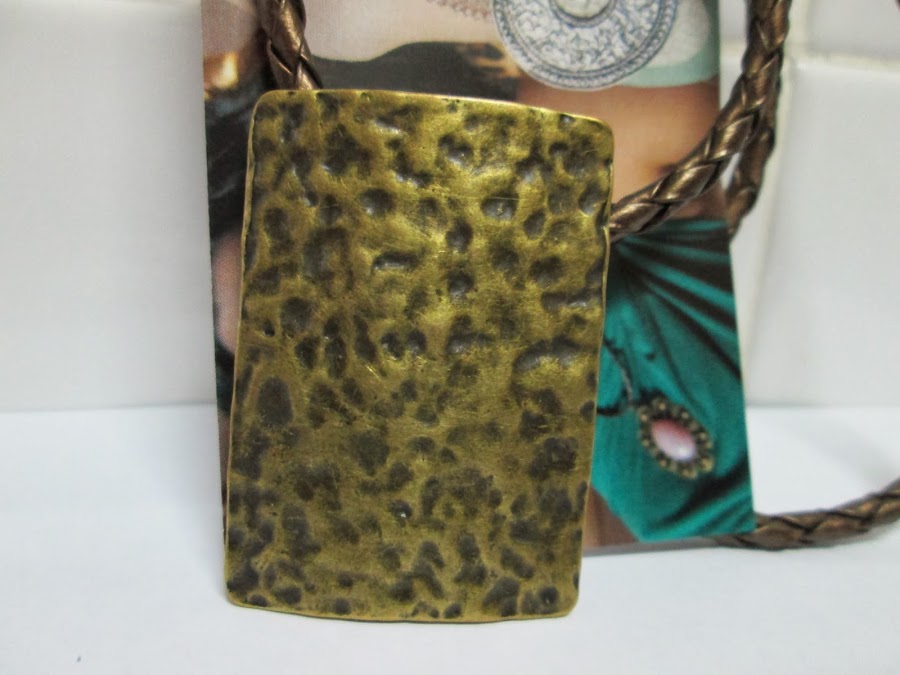 Es un collar, que tiene un cordón trenzado de color bronce y un rectángulo rugoso, dorado envejecido, precioso. Tiene un estilo, que tira, un poco a rústico, que me encanta. Y la medida de largo es de 25 cm aproximadamente.