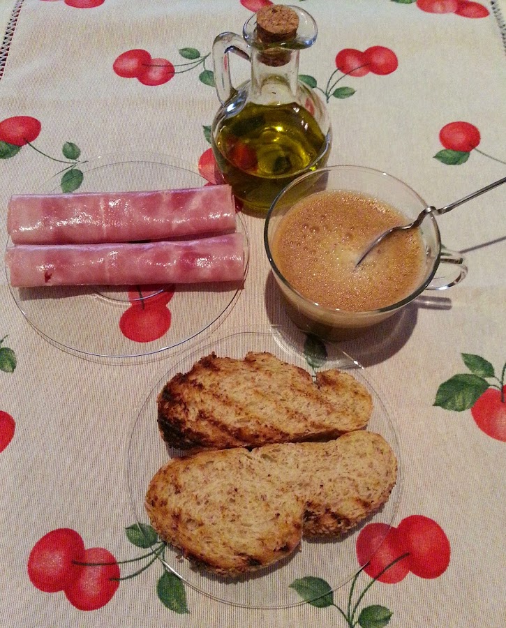 - Tostada con aceite sólo ó con aceite y tomate con jamón serrano, cocido ó pavo