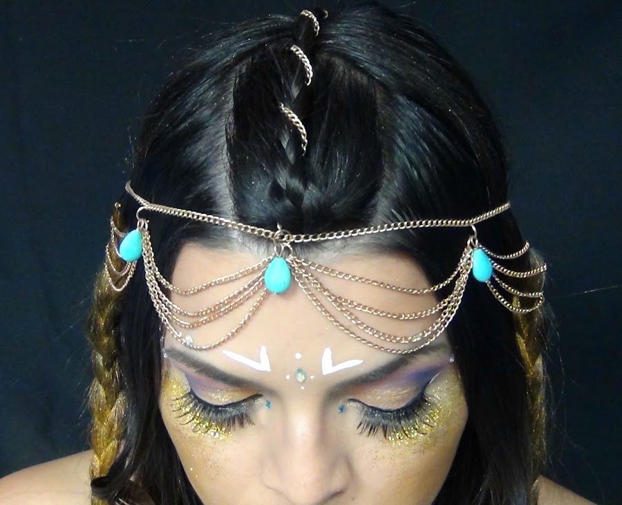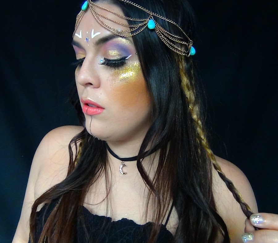A pesar de ello me atreví y quise recrear un maquillaje de fantasía, basado en la tendencia Boho Chic. Que se inspira en la moda hippe y en la moda étnica. Sólo utilicé lo que tenía en mi casa. No compré nada y el resultado quedó bastante bonito.