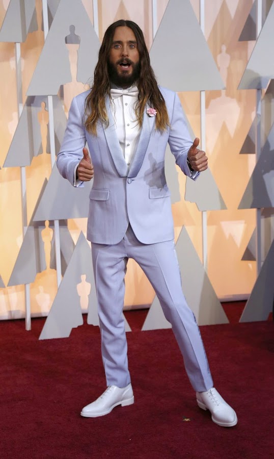 Y respecto a los chicos, porque también los tenemos muy olvidados me quedo con Jared Leto con un traje de chaqueta celeste y divertido, porque sinceramente estoy cansado de ver trajes negros, pajaritas negras y camisas blancas. Además, cada vez se lleva más los zapatos blancos y yo estoy enamorado de esa moda actual.