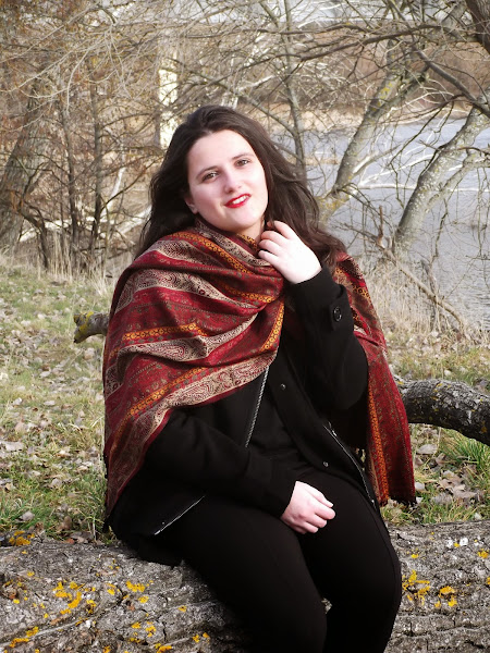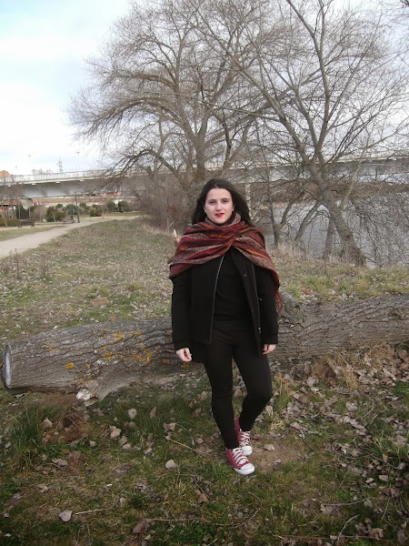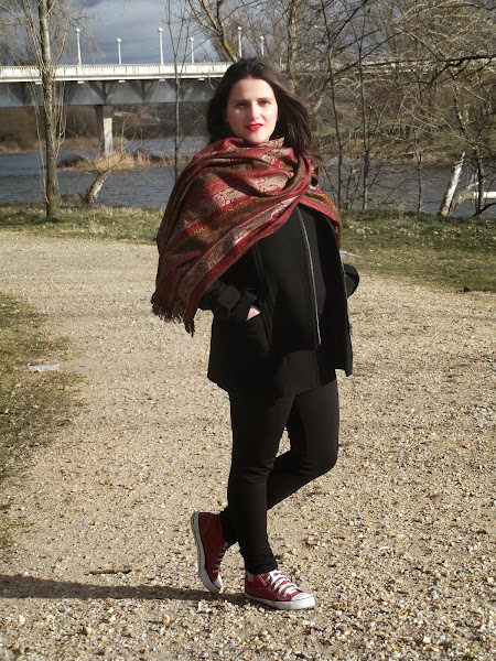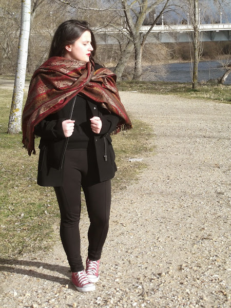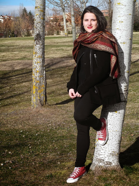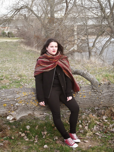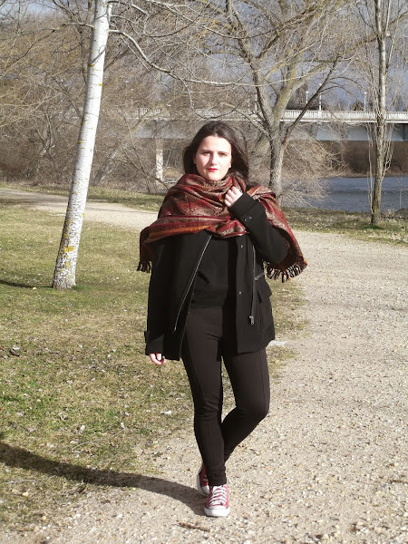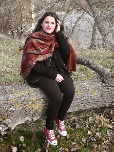 Como no podía ser otra, mi bufandamanta con colores rojos no podría faltar, y por supuesto labios rojos para acompañar.