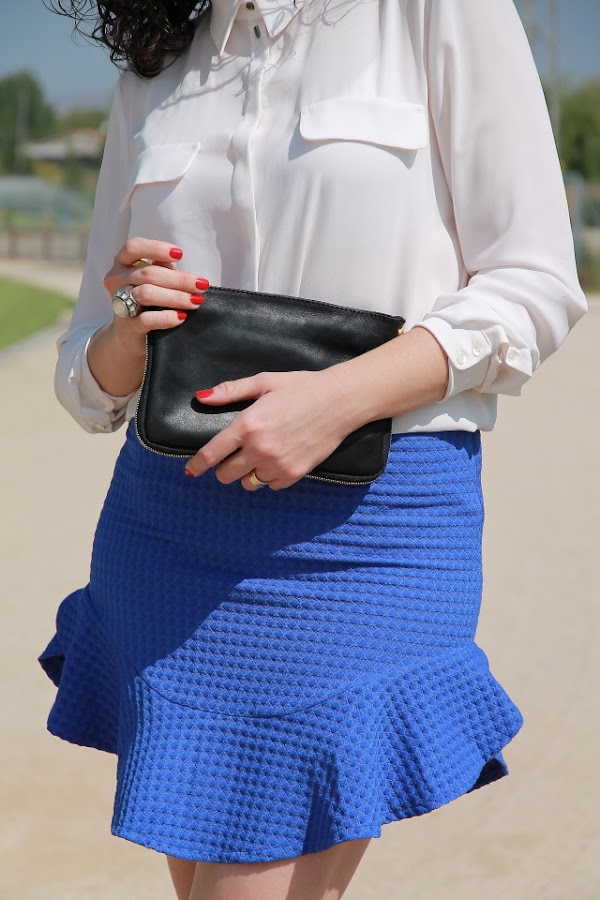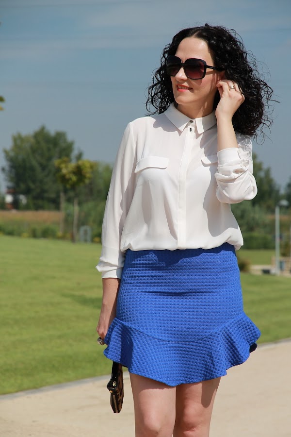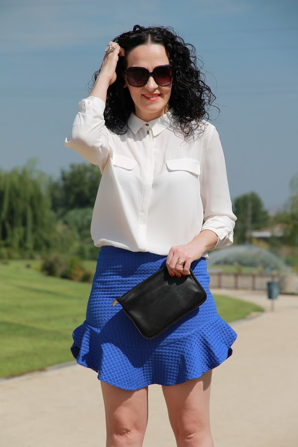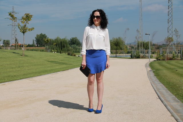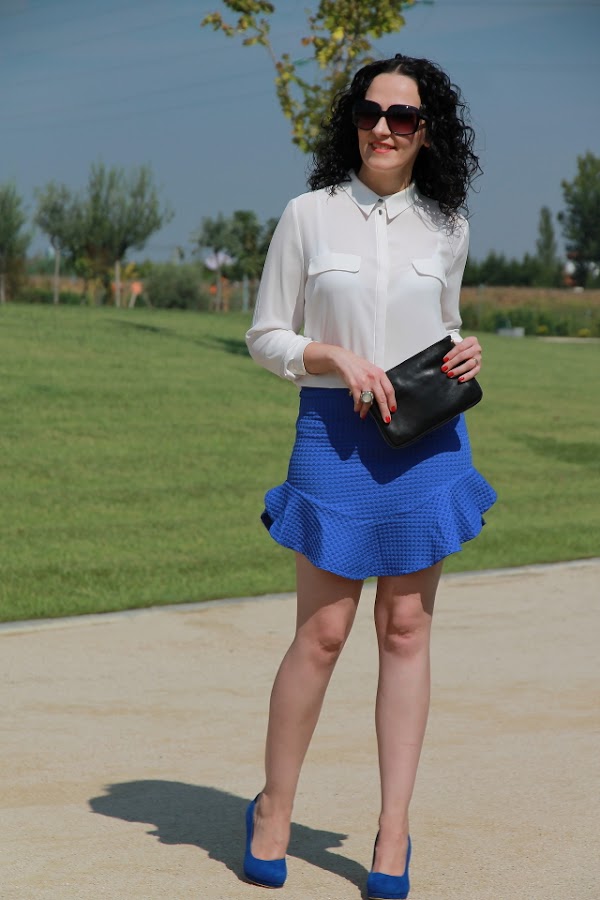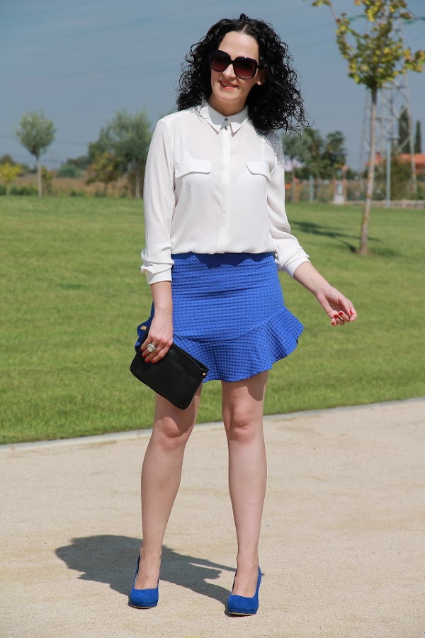 Mis colores favoritos ya los sabéis de sobras pero existen otros que también me gustan mucho y que utilizo normalmente en mis looks, uno de ellos es el azul klein. La falda con volantes que llevo hoy la compré en los últimos saldos de las rebajas de verano. Lo primero que me llamó la atención de ella fue el color y luego los volantes terminaron por convencerme. El azul klein combinado con blanco es el mix que más me gusta, por eso he optado por llevarla con una mi blusa blanca favorita.