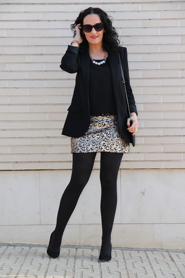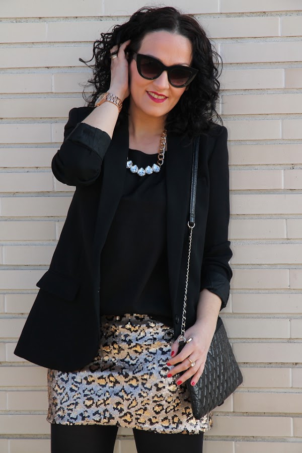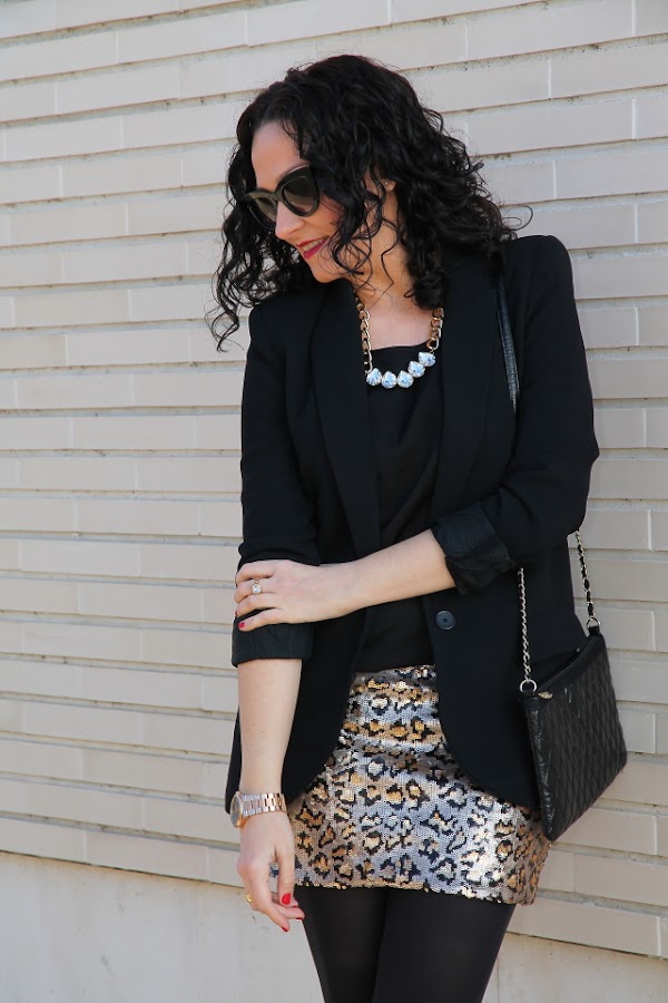 Este año con los amigos decidimos hacer una Nochevieja diferente, más hogareña. Todos los años lo celebrábamos en un sala de fiestas pero este año nos apetecía cambiar optando por hacerlo en una casa. Este fue el look que llevé aquella noche pero con el pelo liso, un look de fiesta con lentejuelas pero más relajado que otros años ya que la ocasión se prestaba. Opté por una blazer negra, blusa negra y esta preciosa falda de lentejuelas con estampado animal print que me rechifla y que seguro voy a llevar muchas más veces, ya sea con jersey o blusa. Lo que más me gusta de este outfit es el collar de lagrimas de Born Pretty, le aporta un toque muy chic al estilismo sin sobrecargarlo.