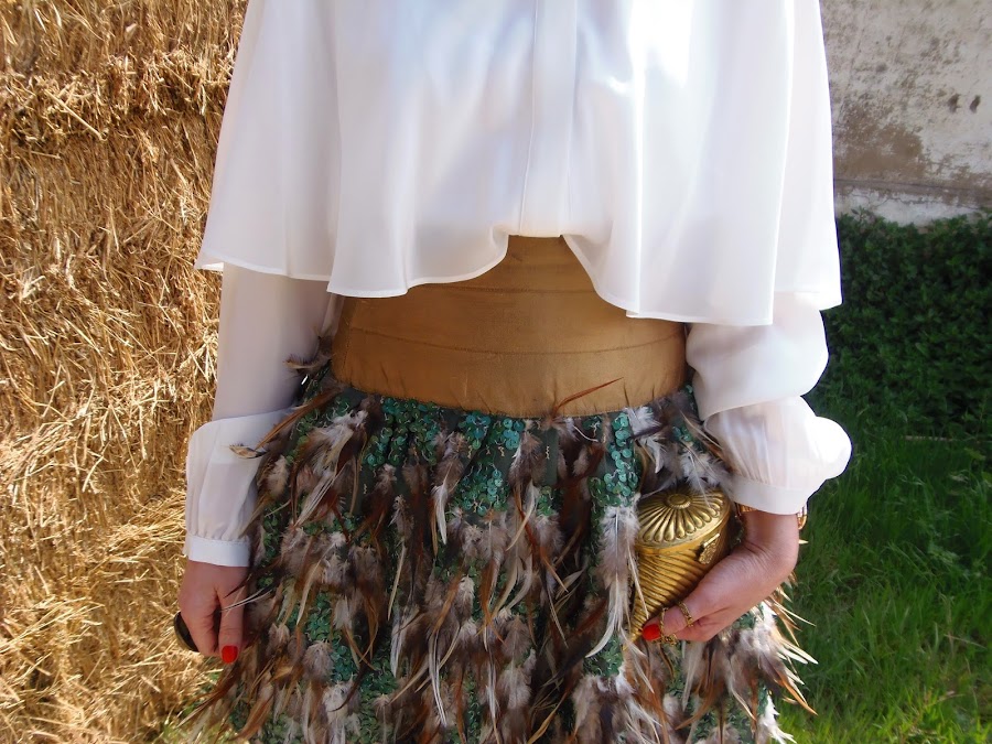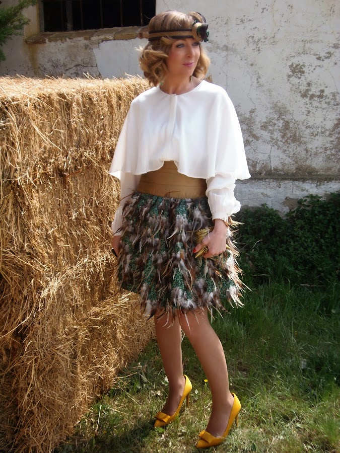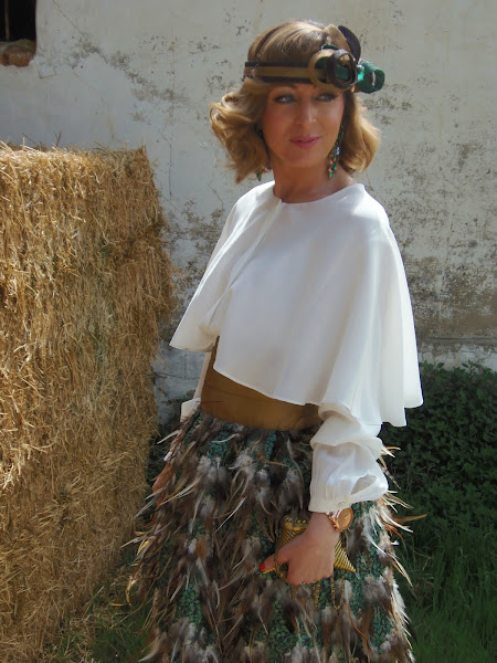 I begin with the skirt. The skirt is a handmade garment also is recycled as it was a dress that took my sister for my wedding, but this year we transform in skirt for added utility. Most important is the skirt fabric is a beautiful fabric composed of feathers and sequins on the photos is not well appreciated. The fabric we bought in Aurora Villalba, one of the best Shops Zaragoza (Hernán Cortés # 9) to buy fabrics. You can find some fabric with very fine fabrics and couture fabrics.
