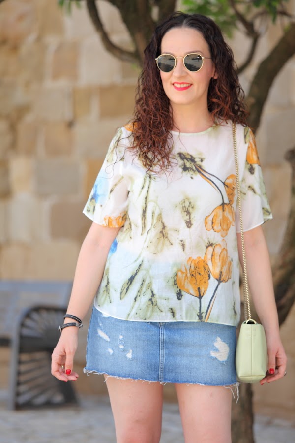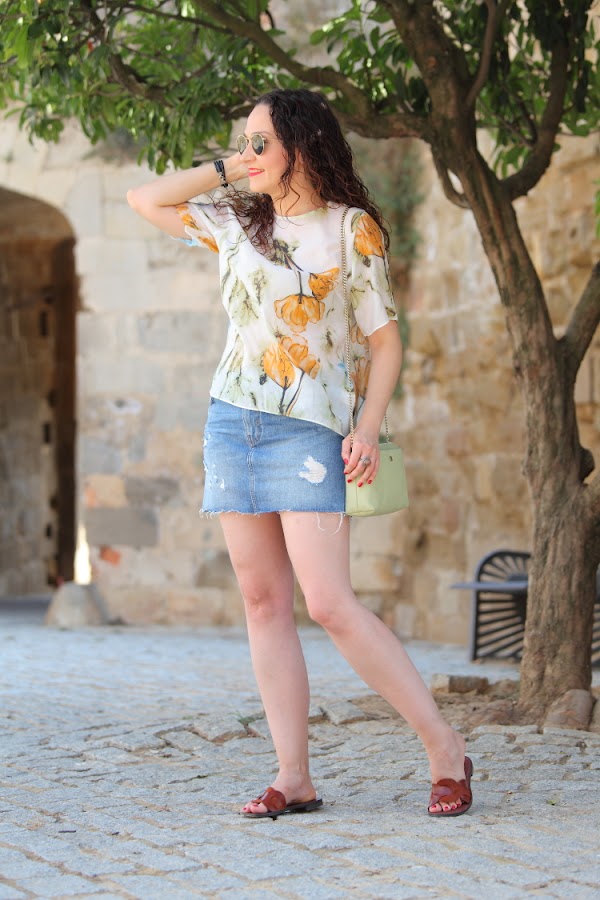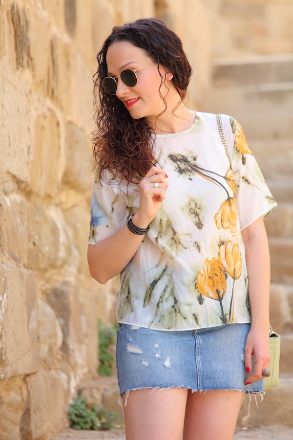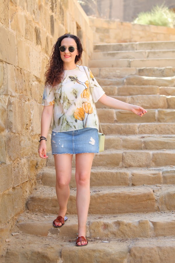 El lunes os conté que el fin de semana del cumple de mi chico lo reservamos para nosotros y que una de las cosas que hicimos fue hacer un poco de turismo por nuestra zona. Cuando queremos conocer lugares con historia casi siempre nos vamos lejos, sin embargo a nuestro alrededor tenemos sitios bonitos sin descubrir. Ese finde nosotros decidimos que nos apetecía conocer más a fondo una de las poblaciones cercanas y para allí que nos fuimos. Hacía mucho, pero mucho calor así que estrené una blusa de flores que compré durante mis pasadas vacaciones en Oporto. La combiné con una mini falda tejana, palas camel y un bolso que compré hace bastante tiempo pero que todavía no había estrenado.