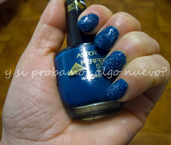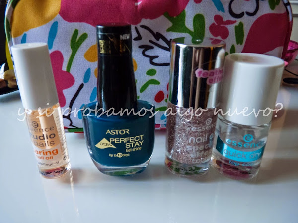 Primero he usado el aceite para el cuidado de las uñas y las cutículas de Essence, lo que comprado hace poco y no sé todavía si es bueno o no. Después el esmalte azul de Astor que se supone que dura 10 días, a mi me dura uno, pero bueno. Luego he puesto un efecto especial Topper de Essence, con brillantitos. Y por último el top coat de Essence también. Este es el resultado.