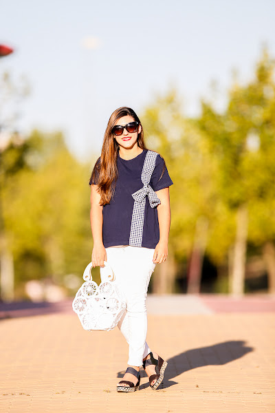 Mi combinación favorita para lucir esta camiseta es con jeans blancos y alpargatas con cuña. Los looks clásicos que combinan el color azul marino y el blanco son mis favoritos, especialmente en la época estival.