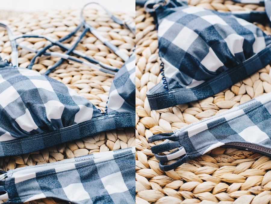 Se trata de un bikini con top de triángulo y espalda cruzada en cuadro vichy grande en tonos azules oscuros (aunque pueda parecer gris en las fotos). La braguita es algo altita con los detalles de las aberturas con cintas en los laterales y con forma más bien brasileña. Este bikini tiene unos detalles preciosos. La tela brilla un montón y tiene unos remates preciosos en la parte del pecho. Estoy encantada con la elección que he hecho. A pesar de que había otros muchos modelos que me llamaban la atención, al final este fue el elegido y no me arrepiento. Me alegro de haber descubierto esta tienda porque tienen cositas que no hay en las tiendas que estamos habituados a frecuentar.