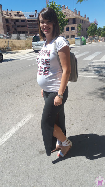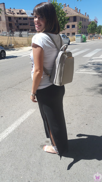 En esta ocasión la combiné con un look bastante de sport con falda larga gris oscura, sandalias planas y camiseta, ¡luciendo barriguita!